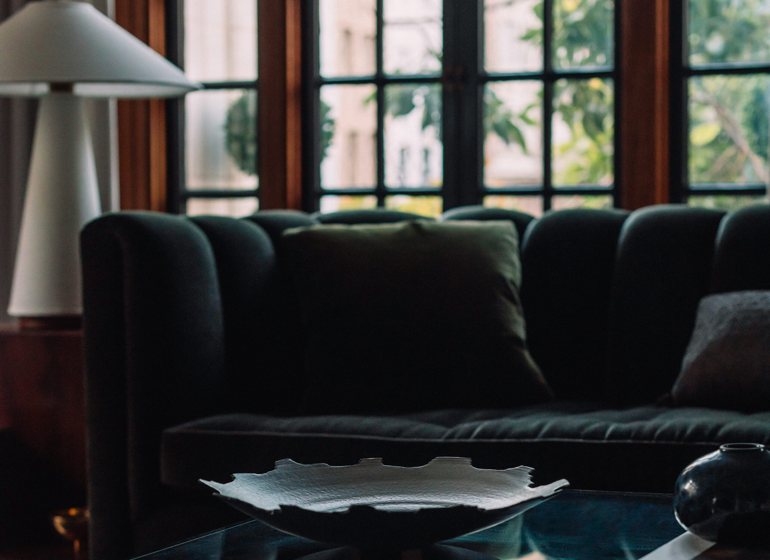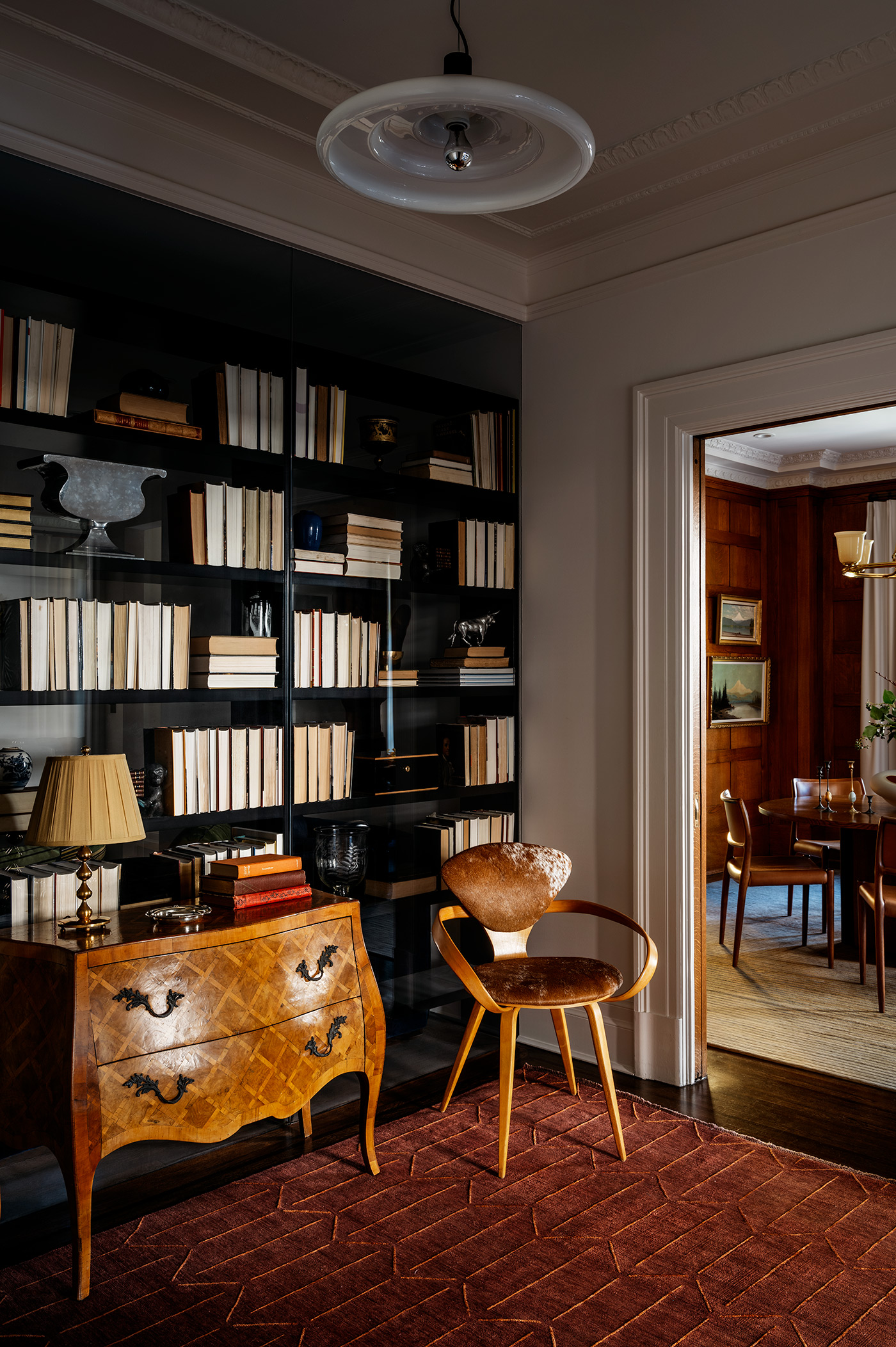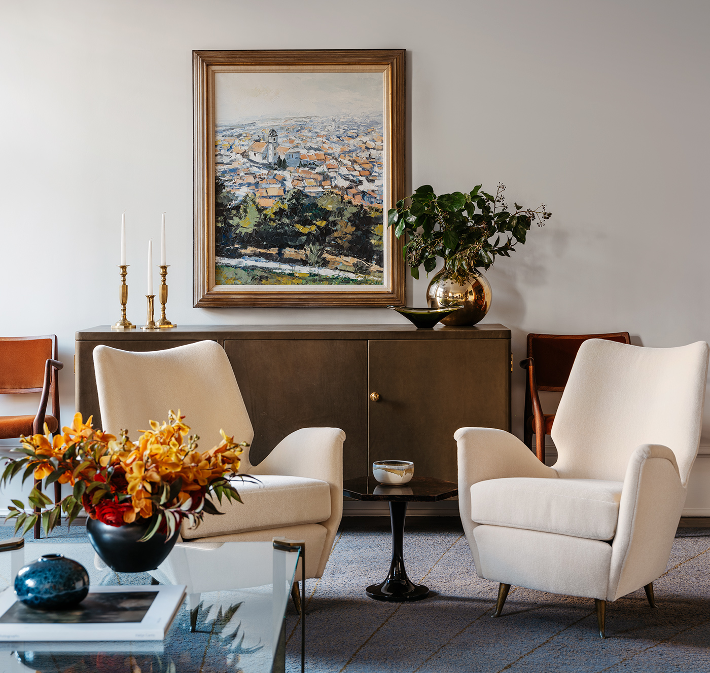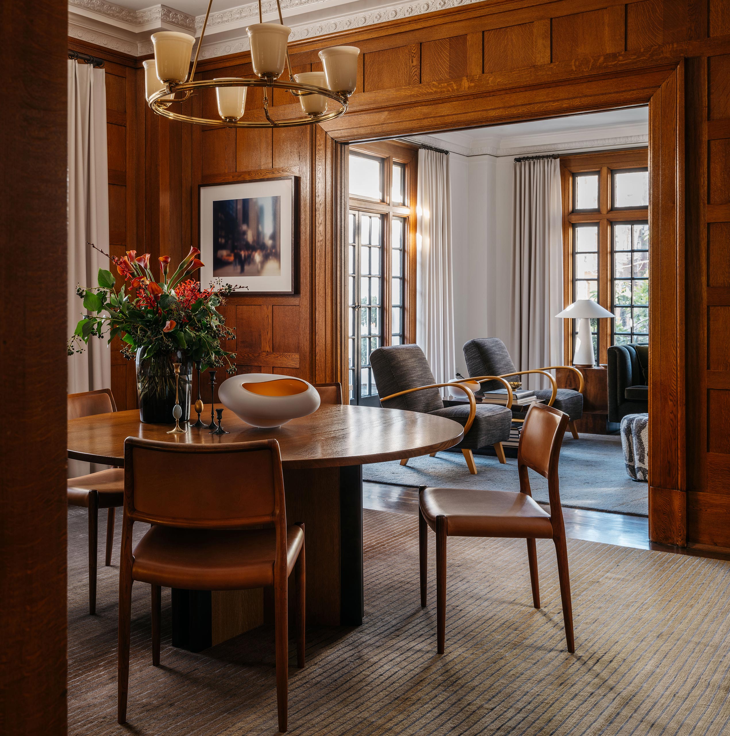 The residence features architecturally significant details throughout — gorgeous crown moldings, high ceilings, hardwood floors, a wood-paneled formal Dining Room, and Juliet balconies. JKA was engaged to infuse these grand rooms with our signature soulful blend of custom, contemporary, antique, and vintage pieces from around the world.