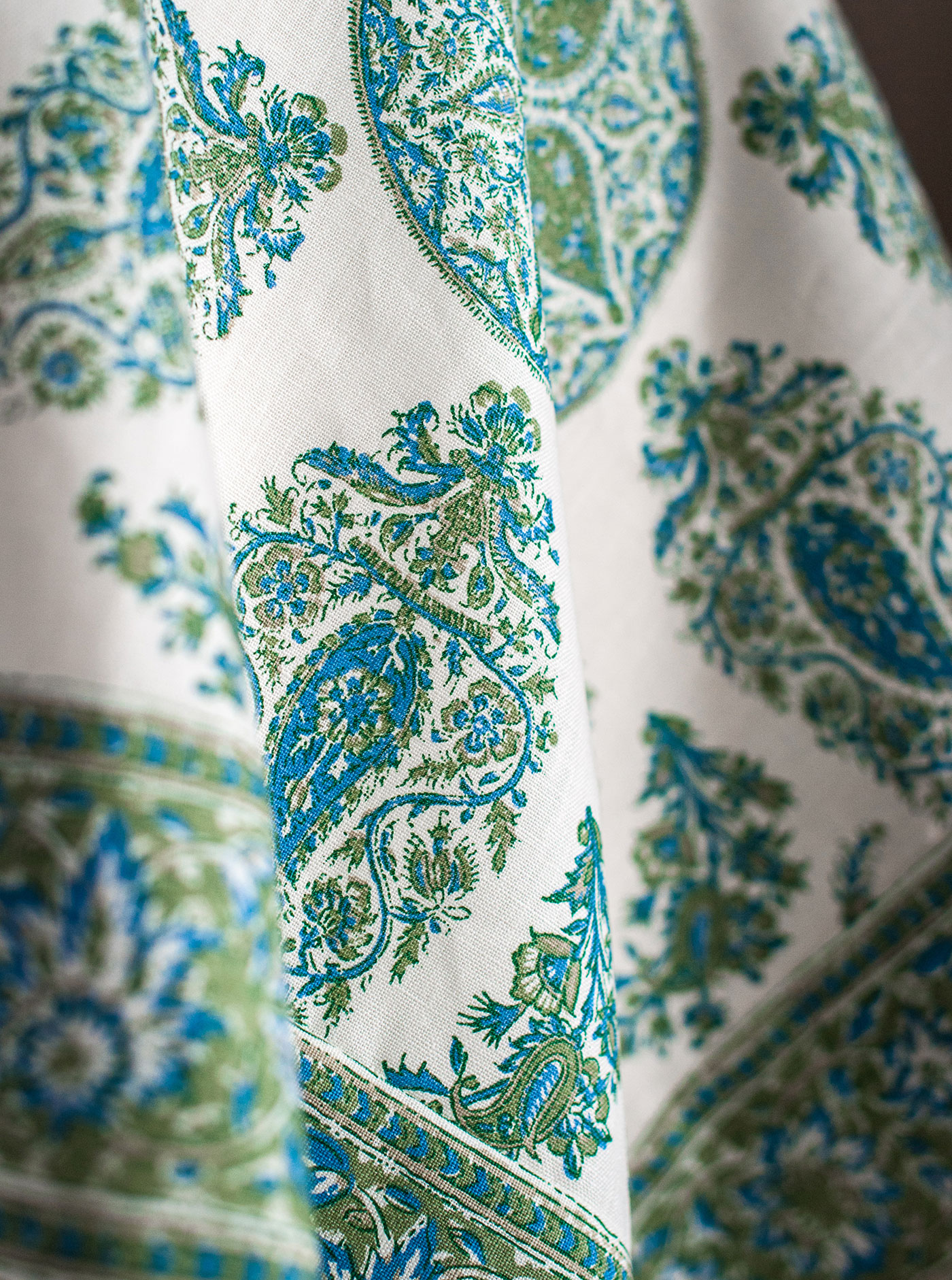 In the dining room, a custom oak dining table supported by a slender steel base sits atop an antique tribal rug. Colorful modern art shares space in the master suite with wall upholstered in delicately hand-painted fabric.