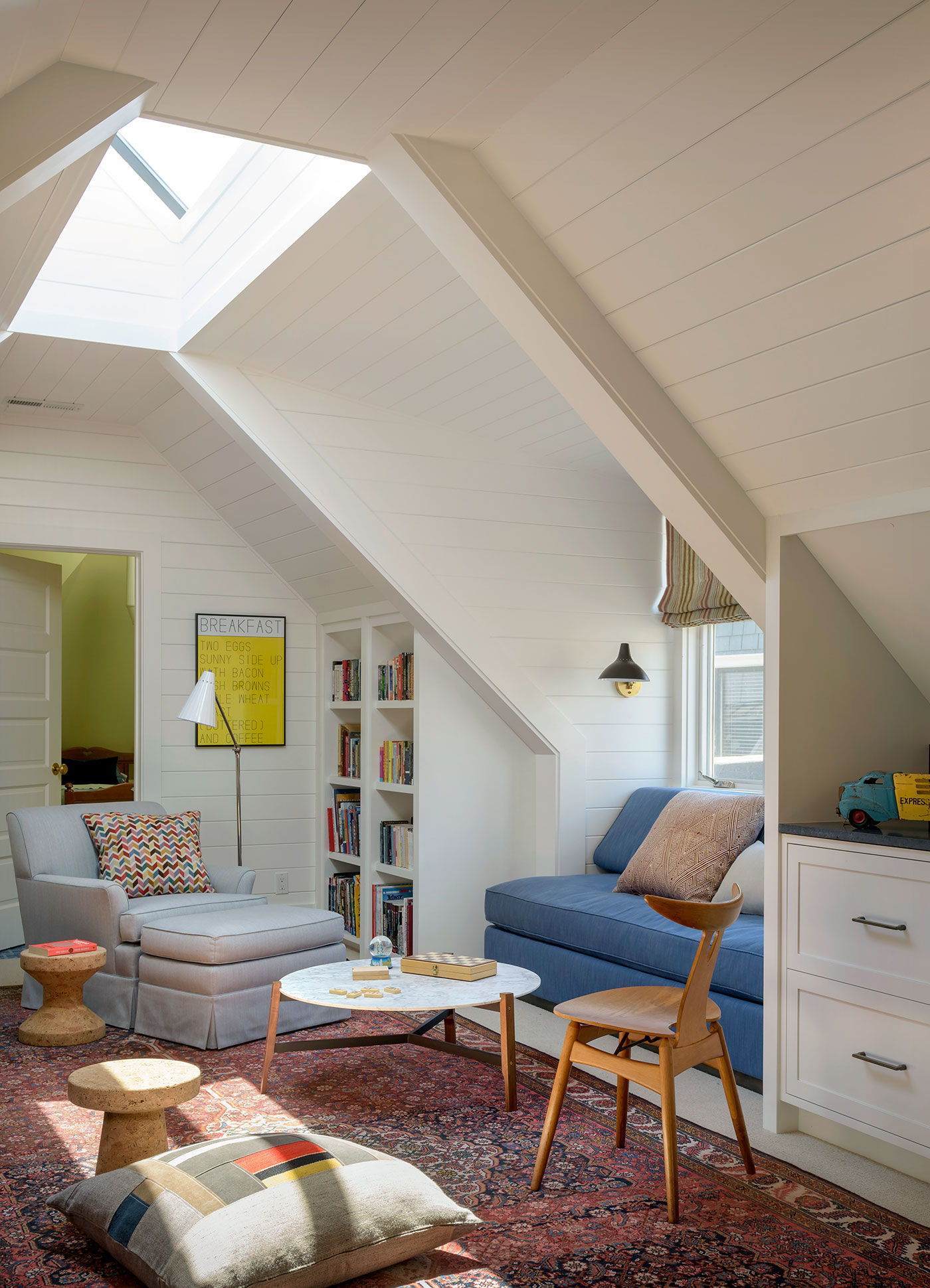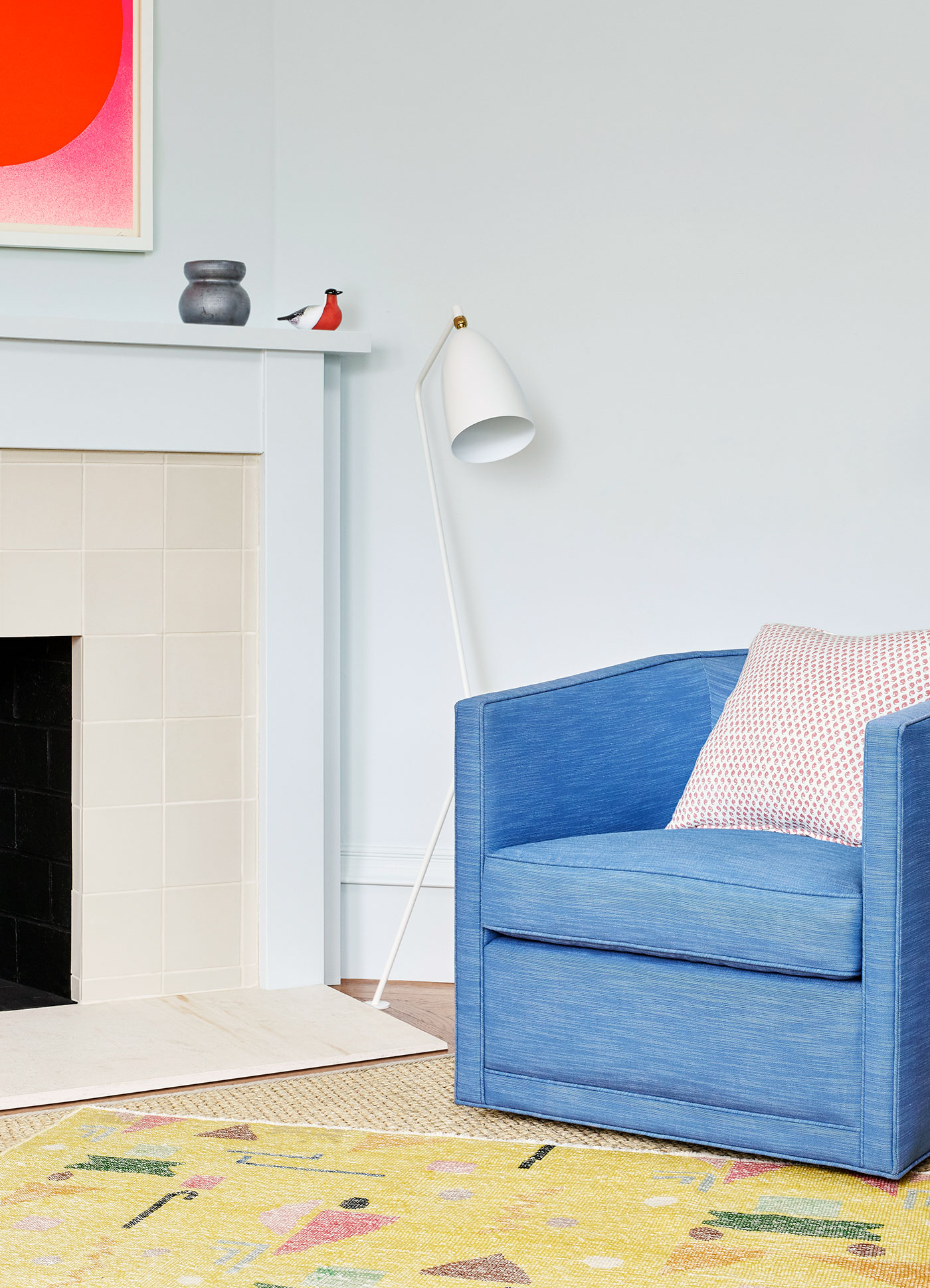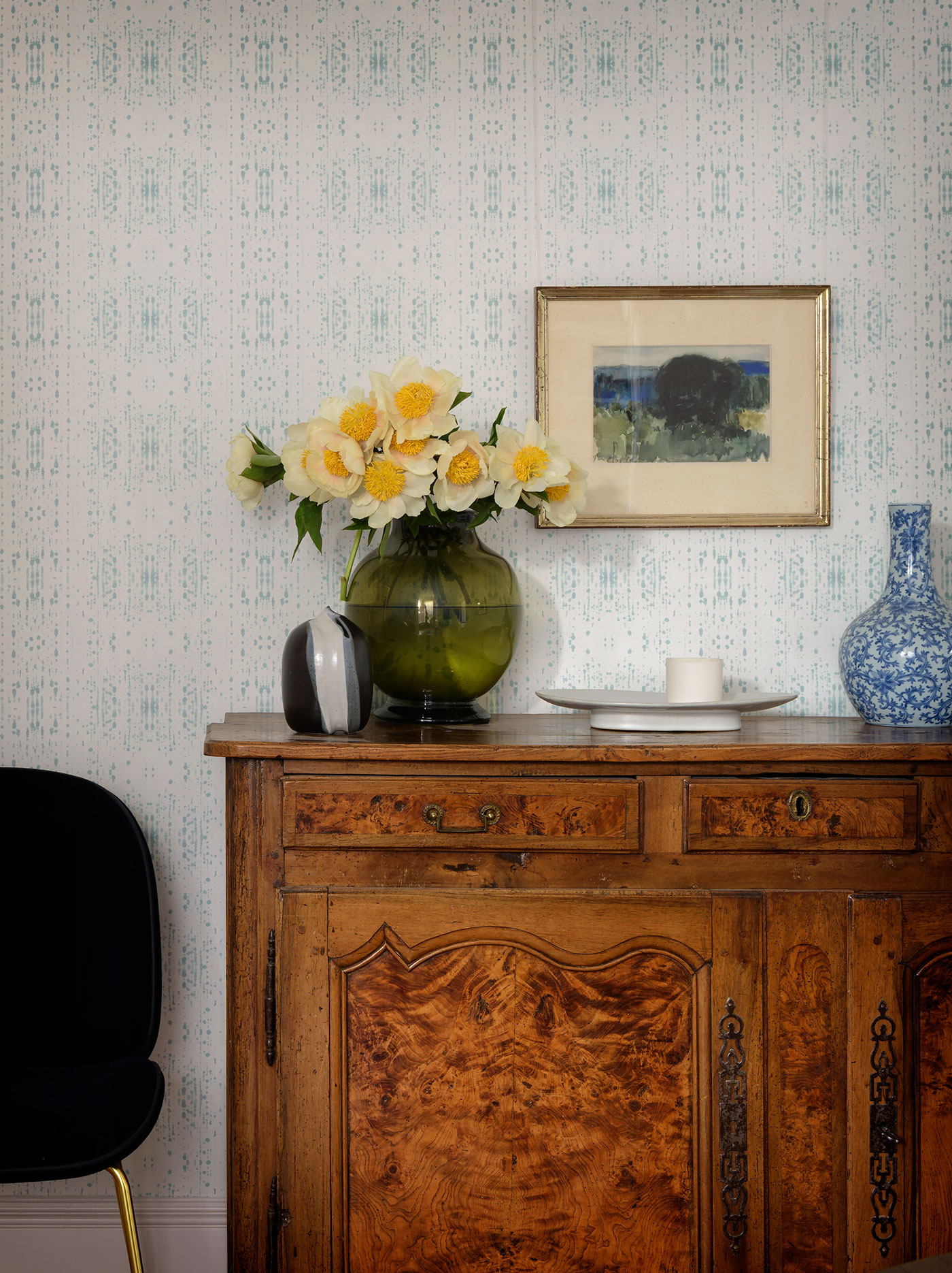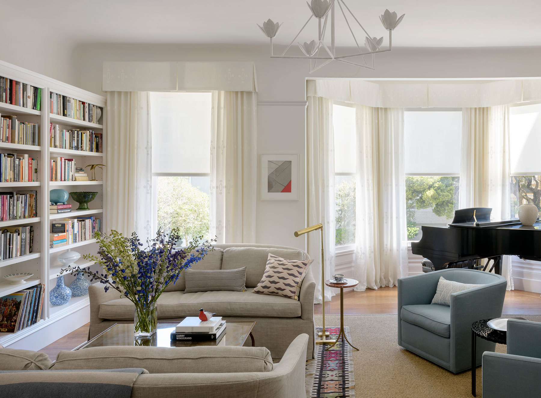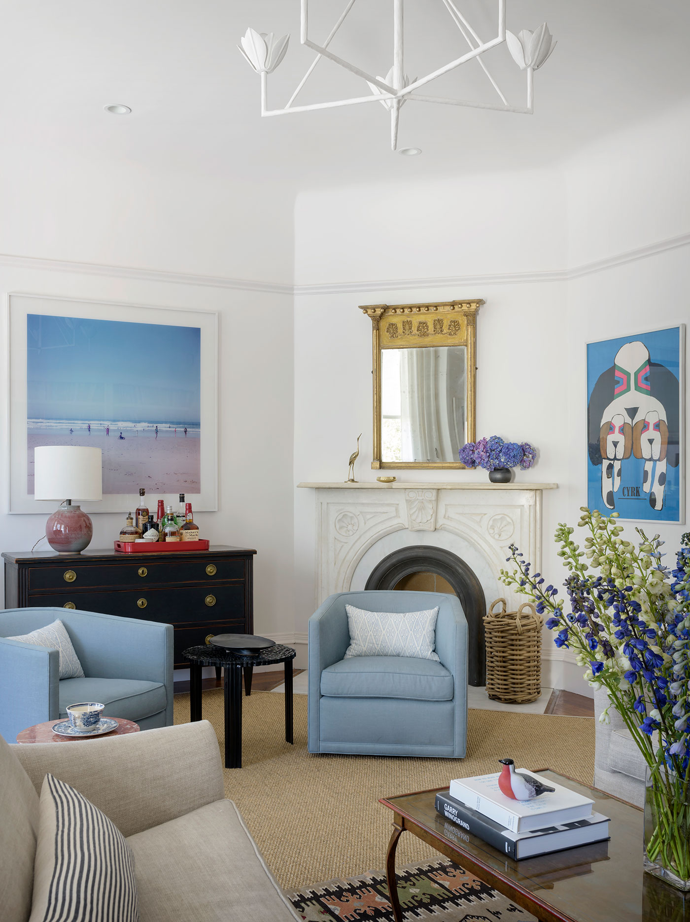 Tasked with updating a 1910 Edwardian home, JKA took its cues from the owner’s eclectic tastes, which included a yen for vintage furniture and antiques, as well as modern wallpaper and artwork. Mixing old and new elements, the bright living room features a celestial color palette of pale blue, tan, and white.