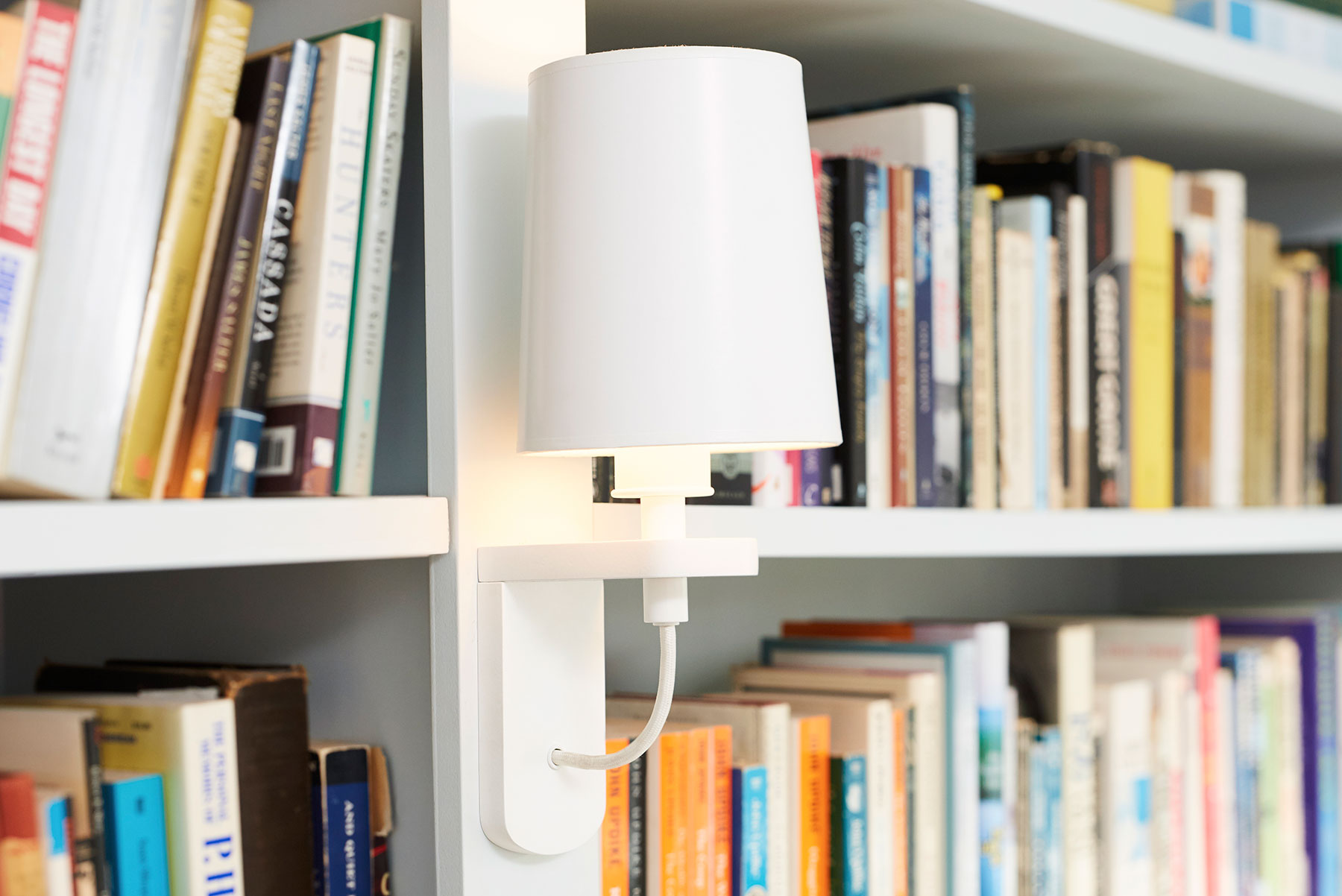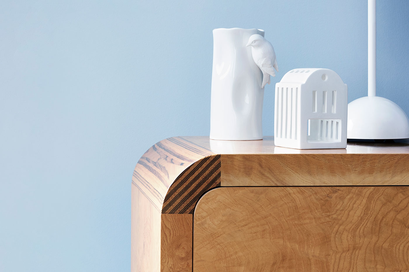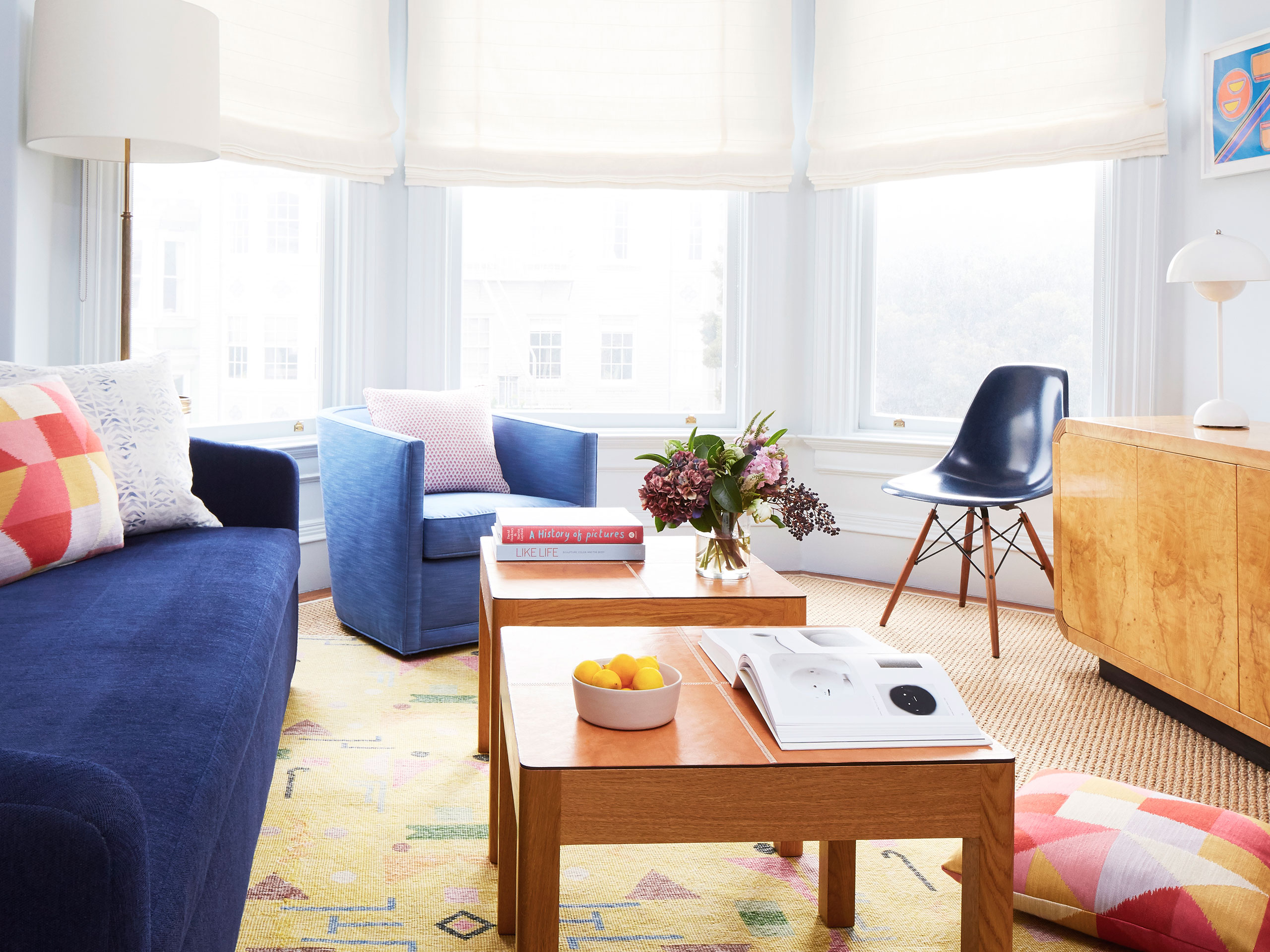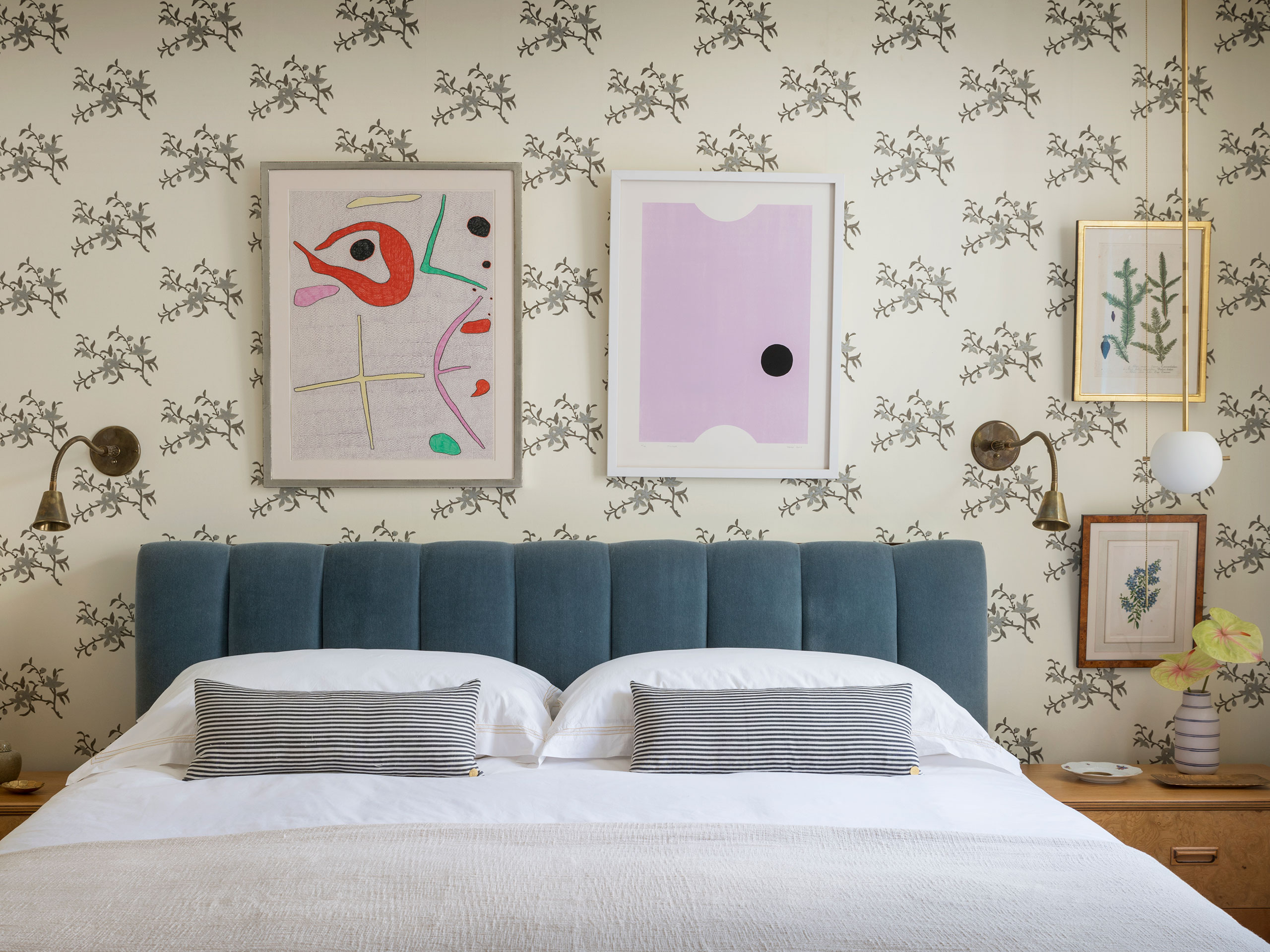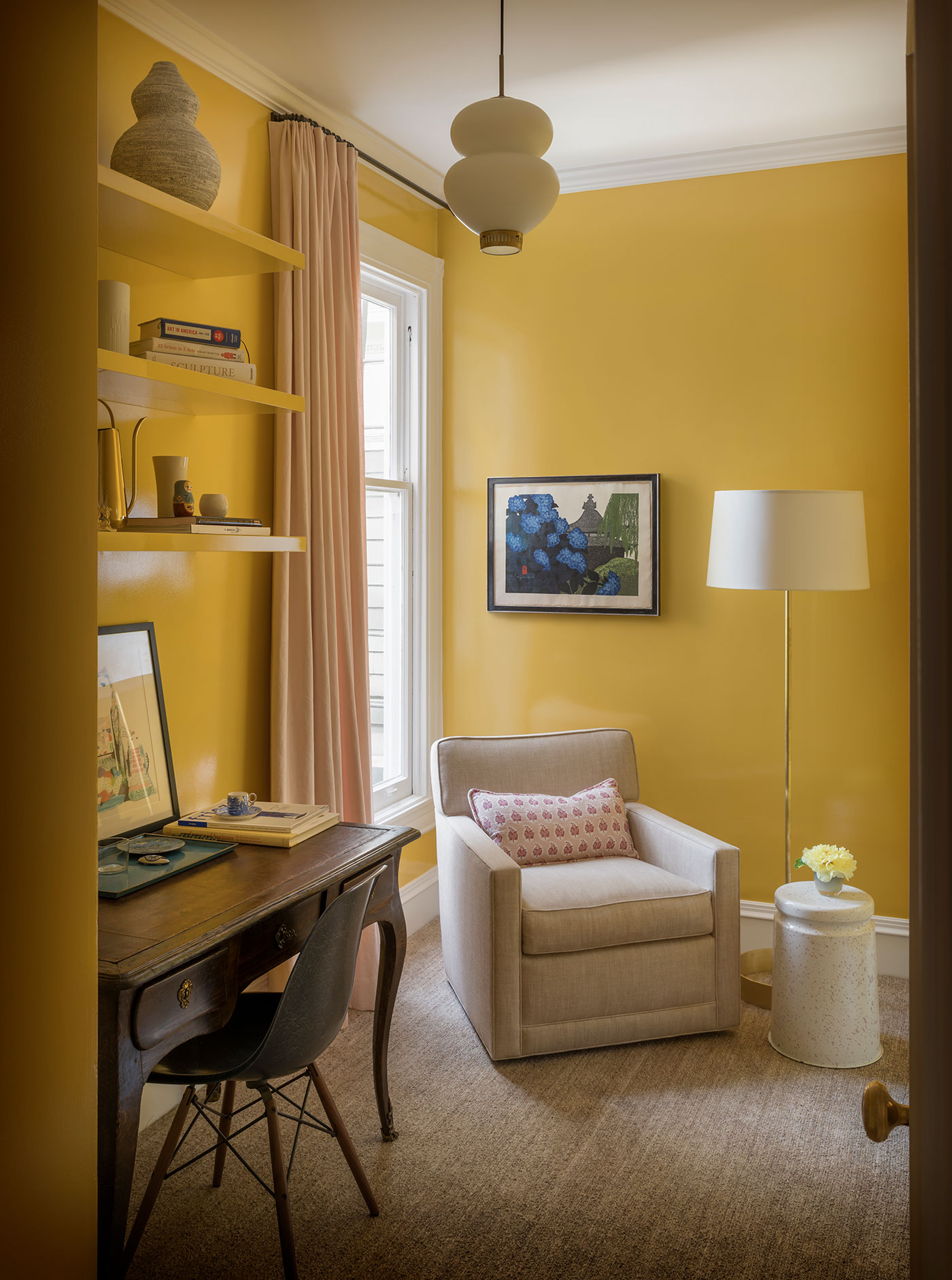 Tasked with updating a 1910 Edwardian home, JKA took its cues from the owner’s eclectic tastes, which included a yen for vintage furniture and antiques, as well as modern wallpaper and artwork. Mixing old and new elements, the bright living room features a celestial color palette of pale blue, tan, and white.