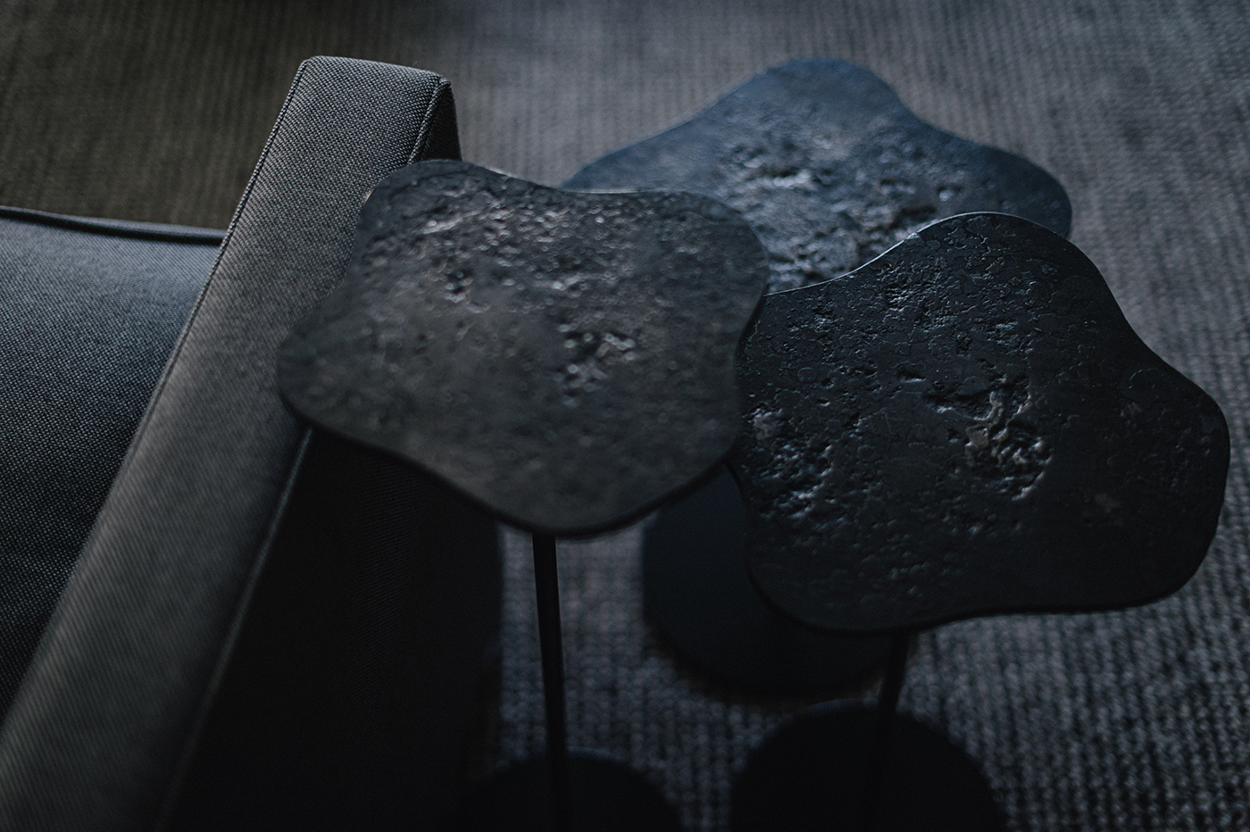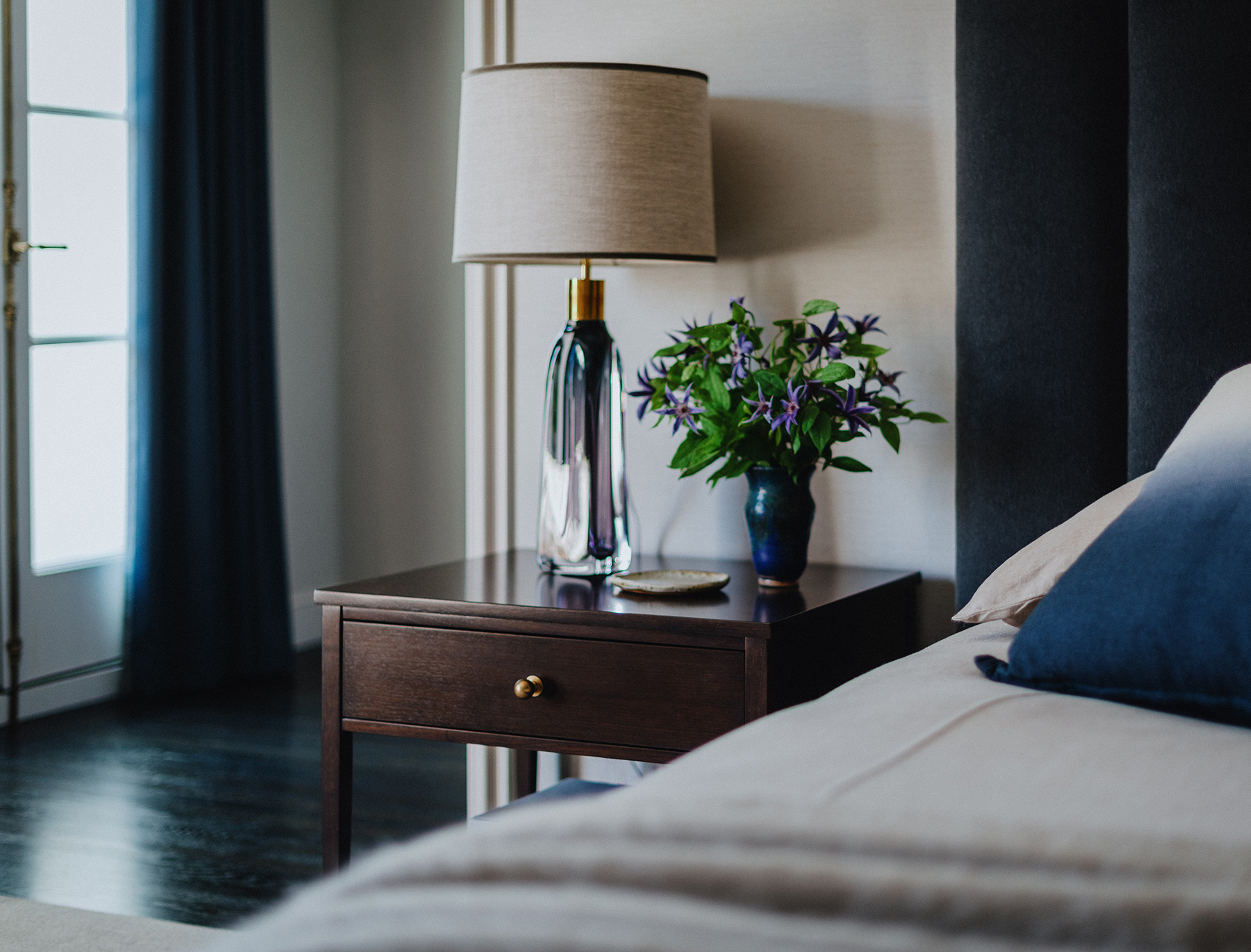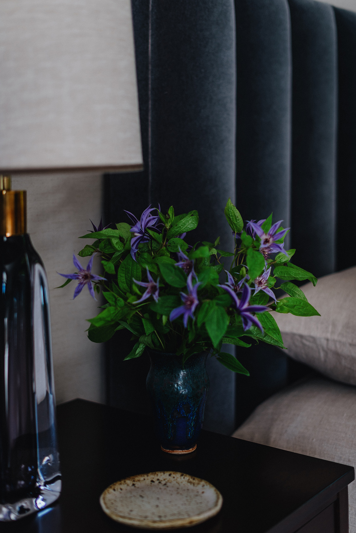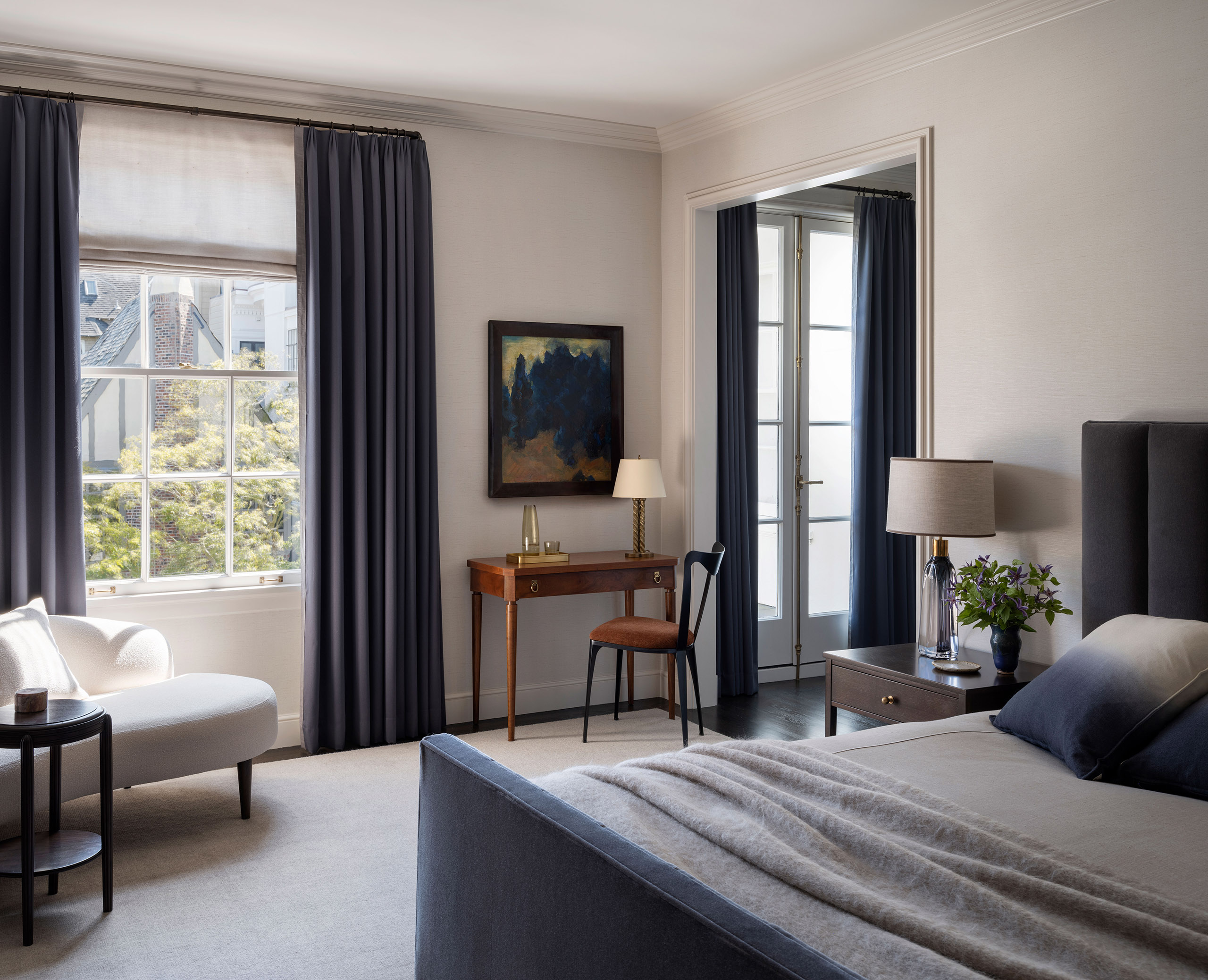 The Primary Suite features the client’s preferred color of calming blue, a hue that threads through the home’s otherwise achromatic tones and soft textures.