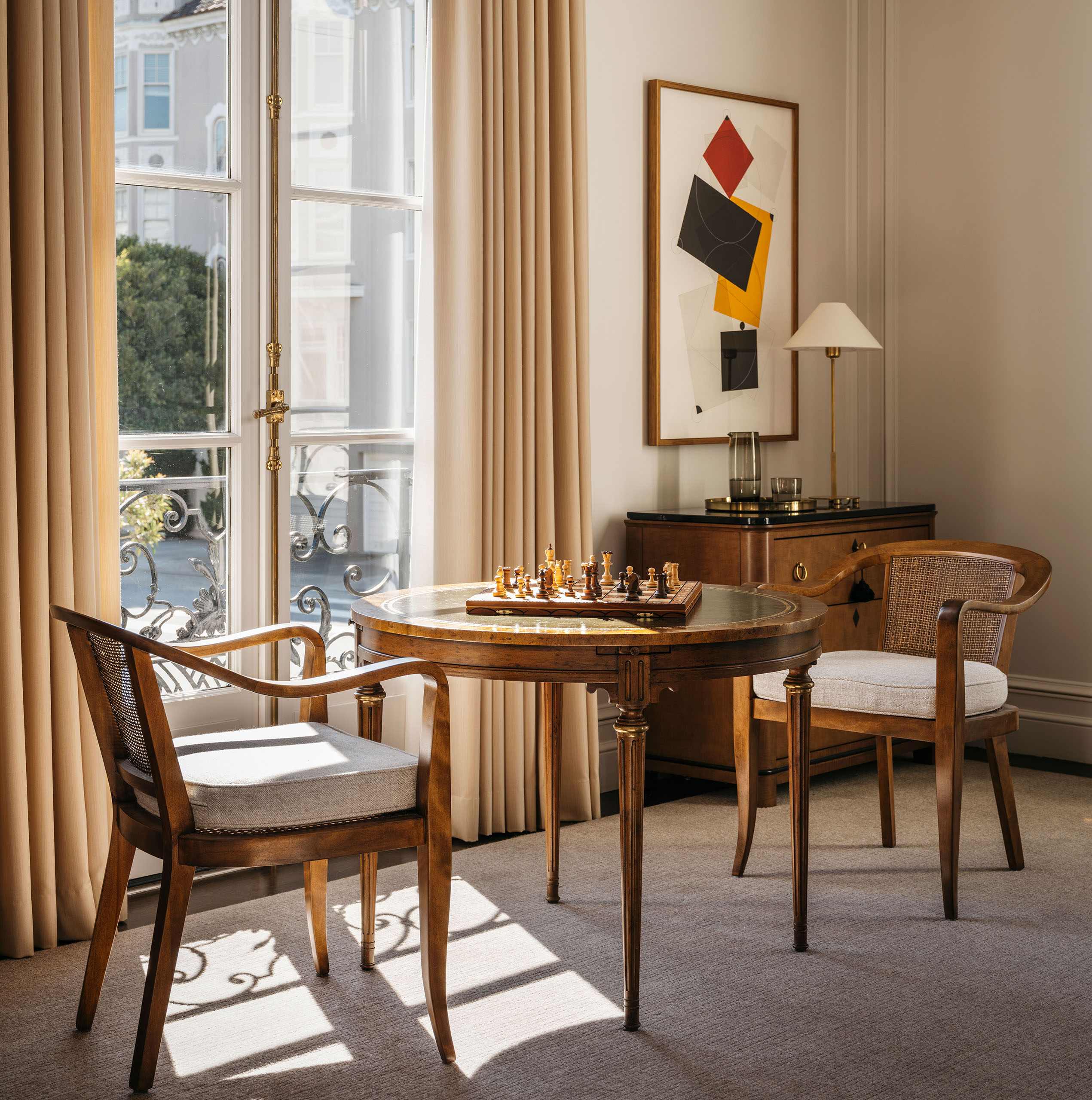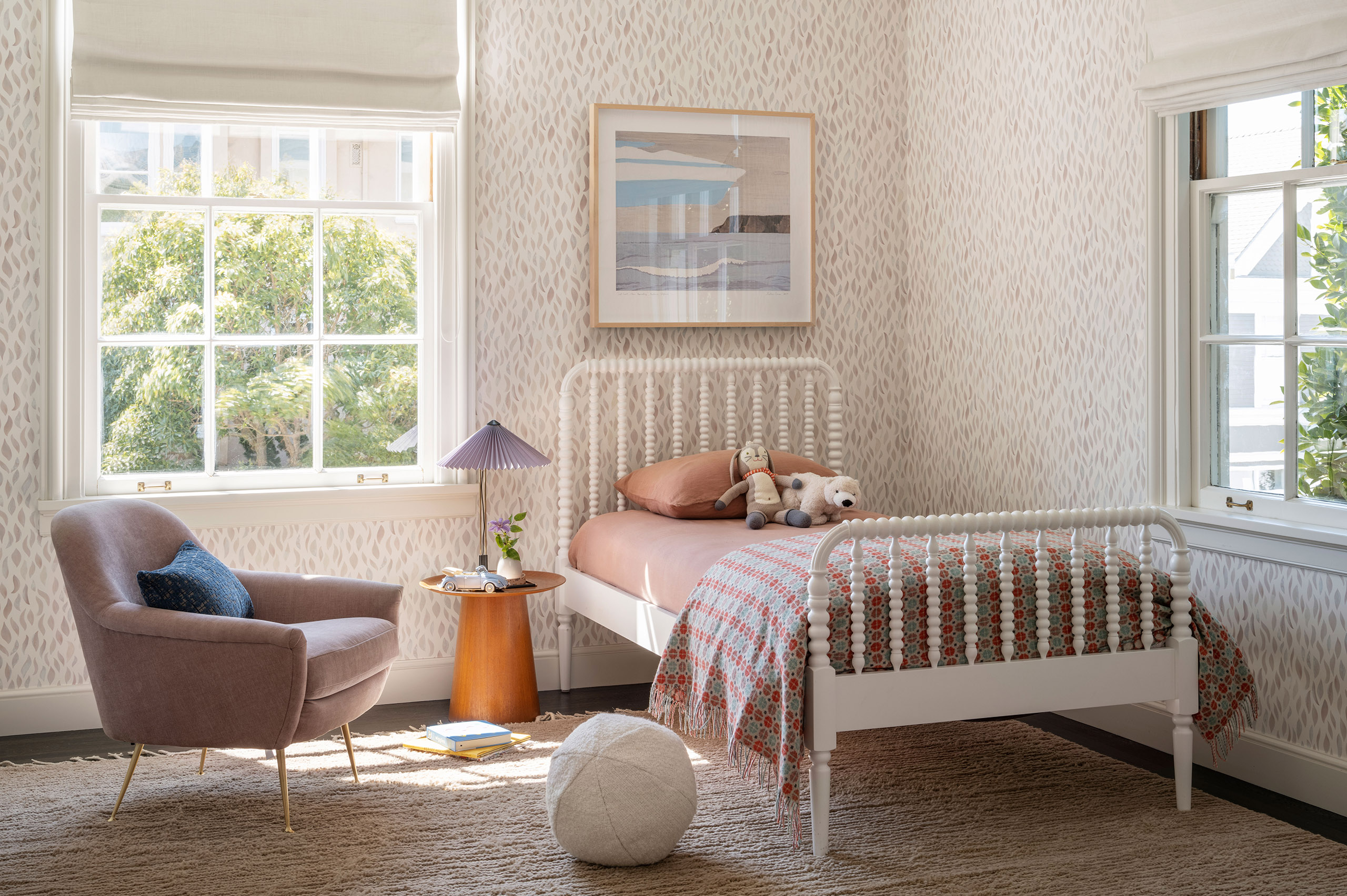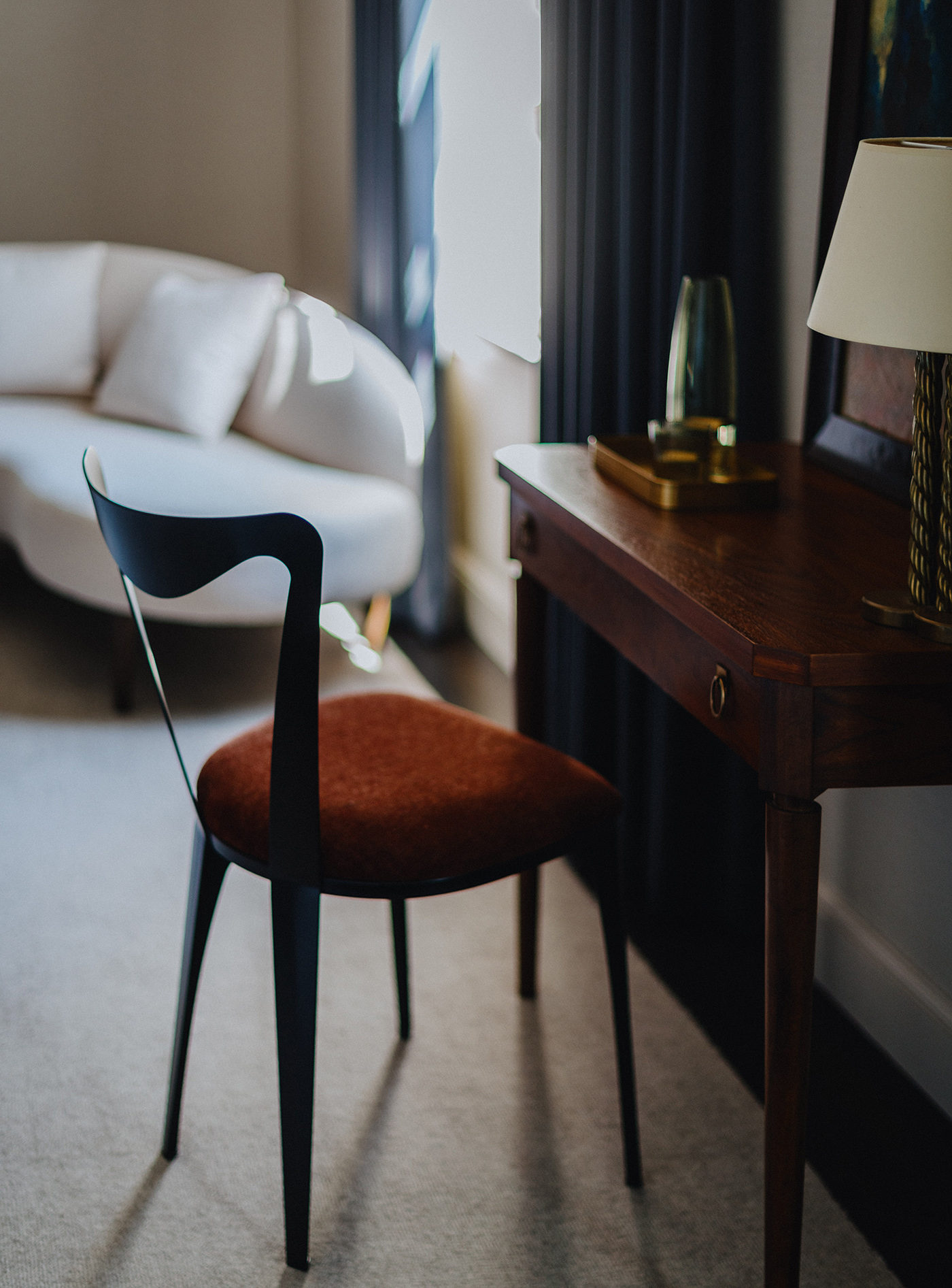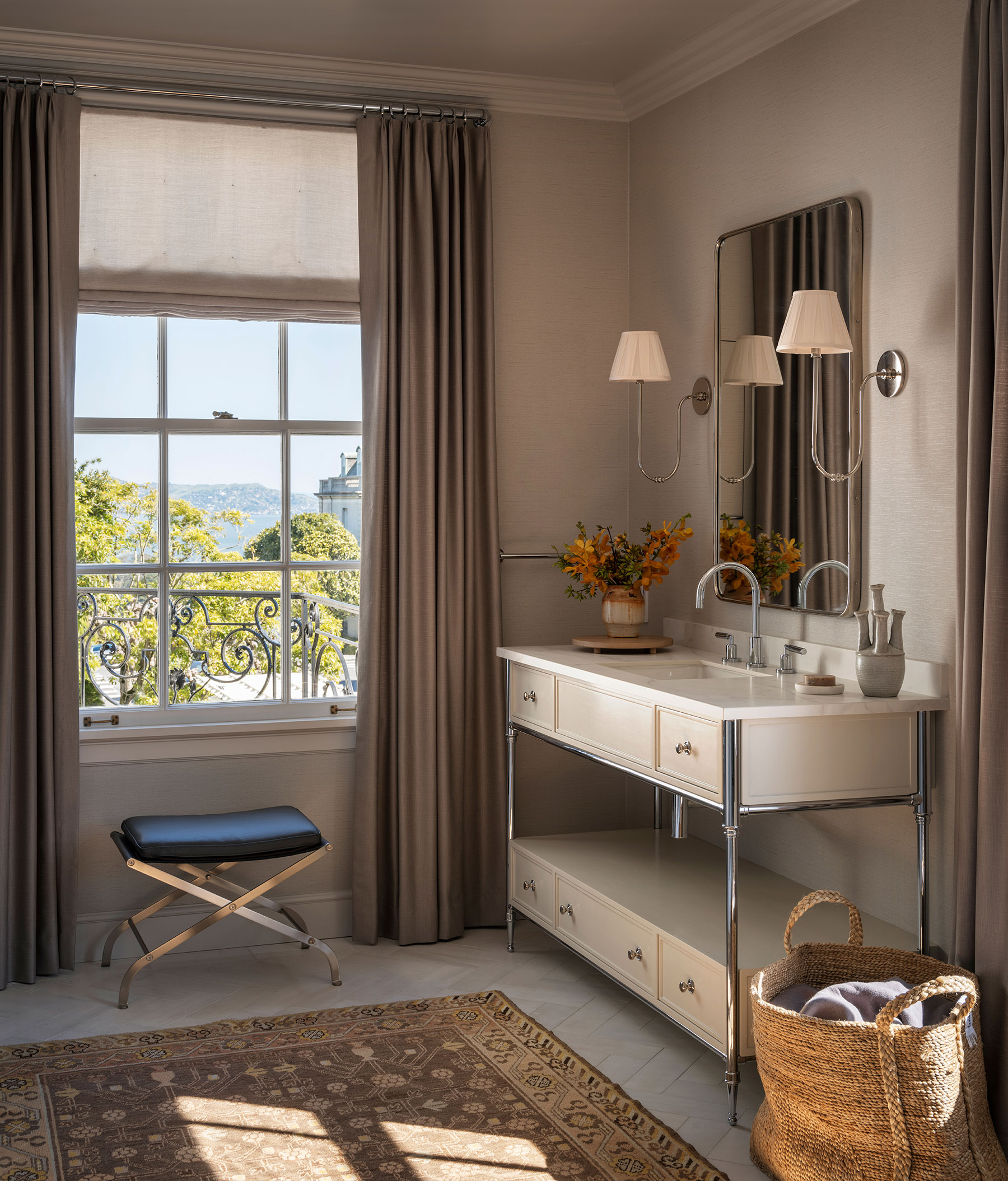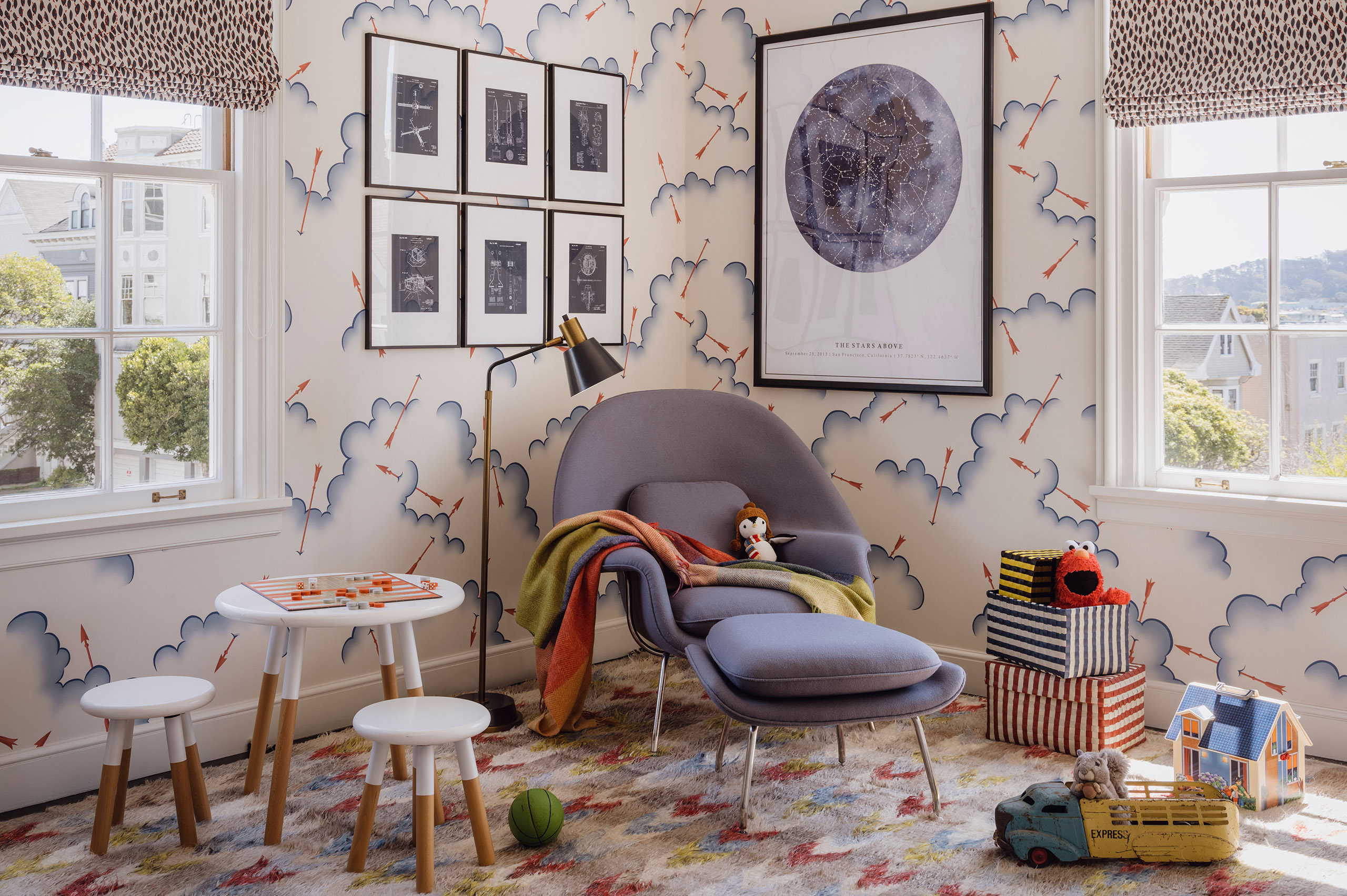 Our clients’ penchant for quiet, understated elegance and a neutral palette also informed the overall design direction for the home, with the occasional injection of an unexpected accent — such as the Mercurio wallpaper in the Boy’s Bedroom depicting voluminous blue clouds pierced by bright red Cupid’s arrows.
