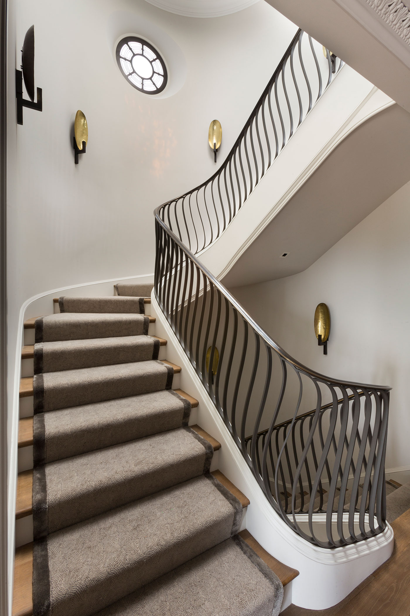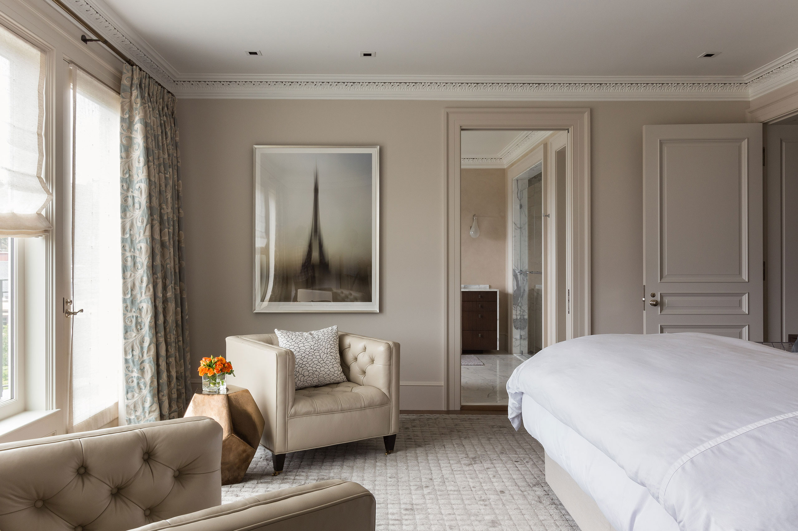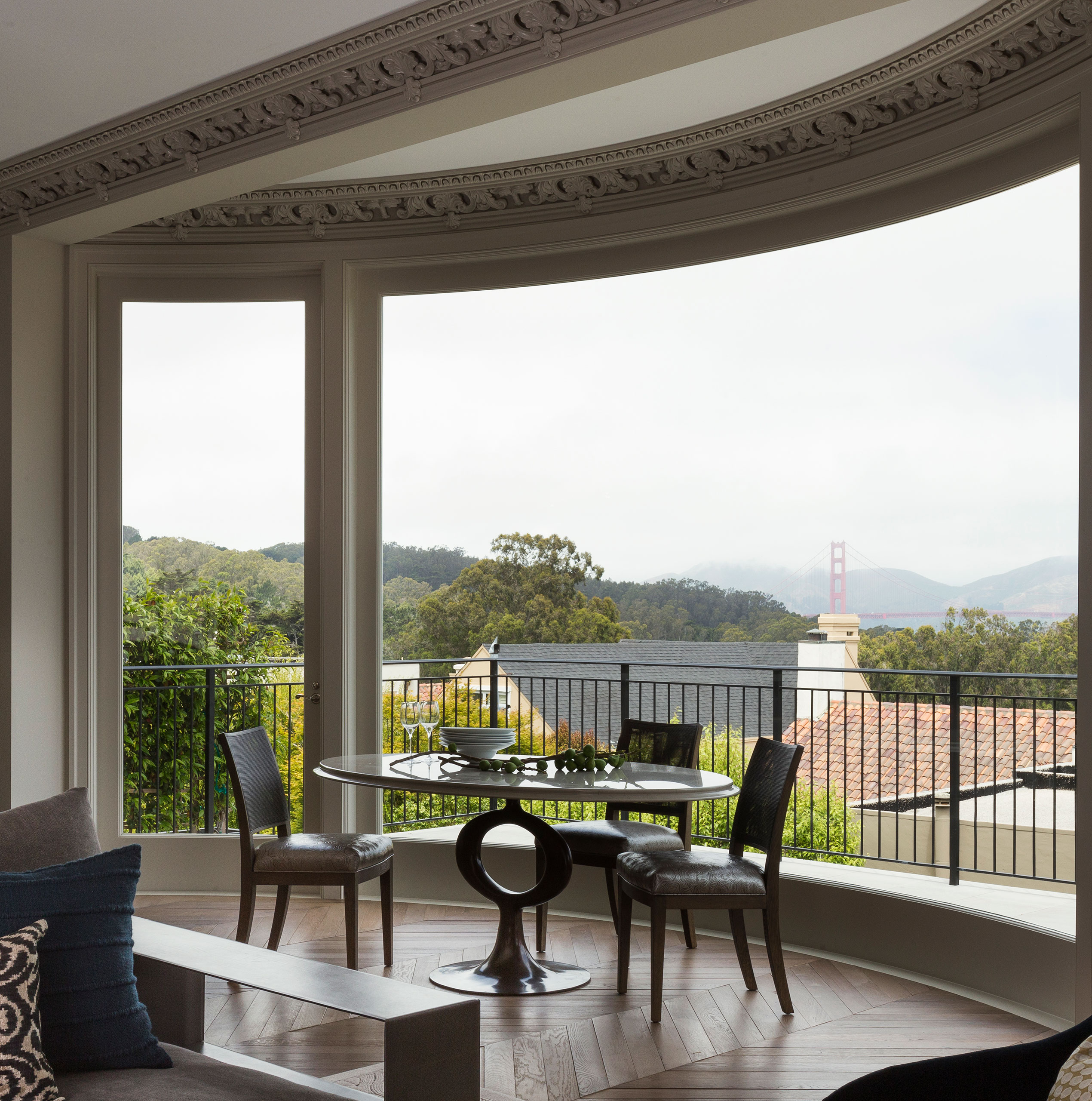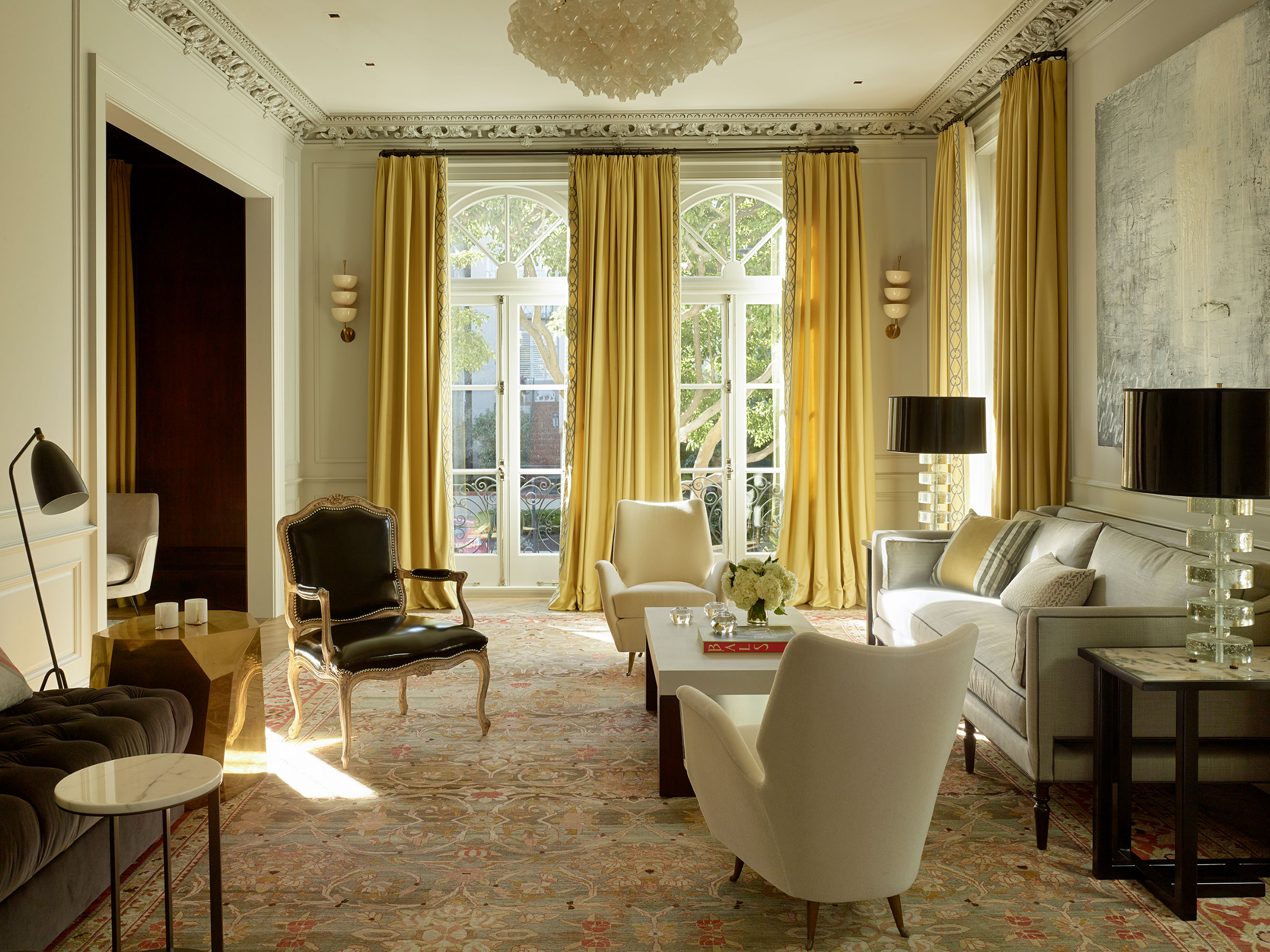 JKA and Sutro Architects reconfigured the house to four full floors connected by a sensuously curved staircase with bronze railing. New custom-finished oak floors, intricate plaster moldings, and floor-to-ceiling curtains evoke the character of Parisian old-world elegance.