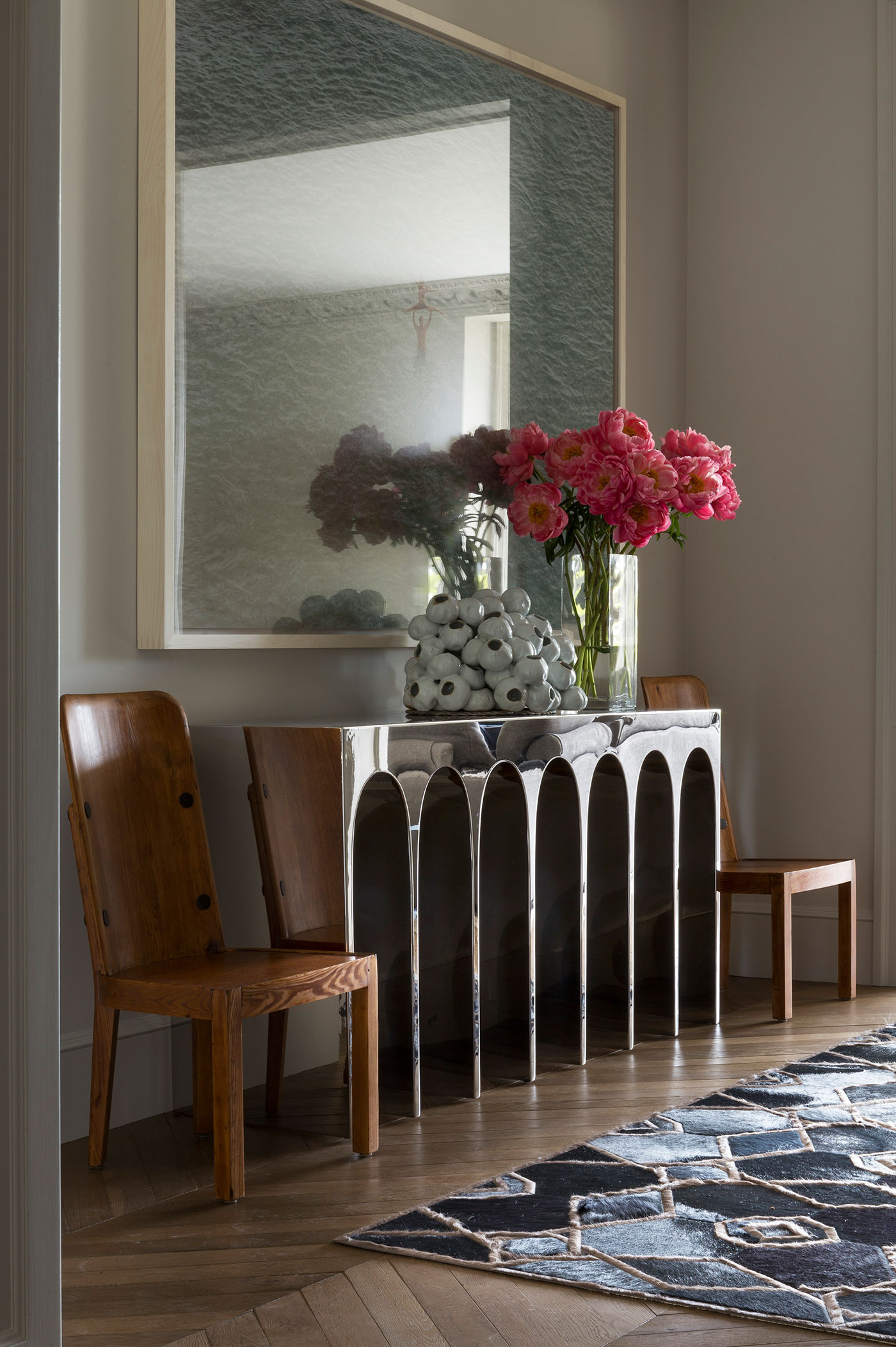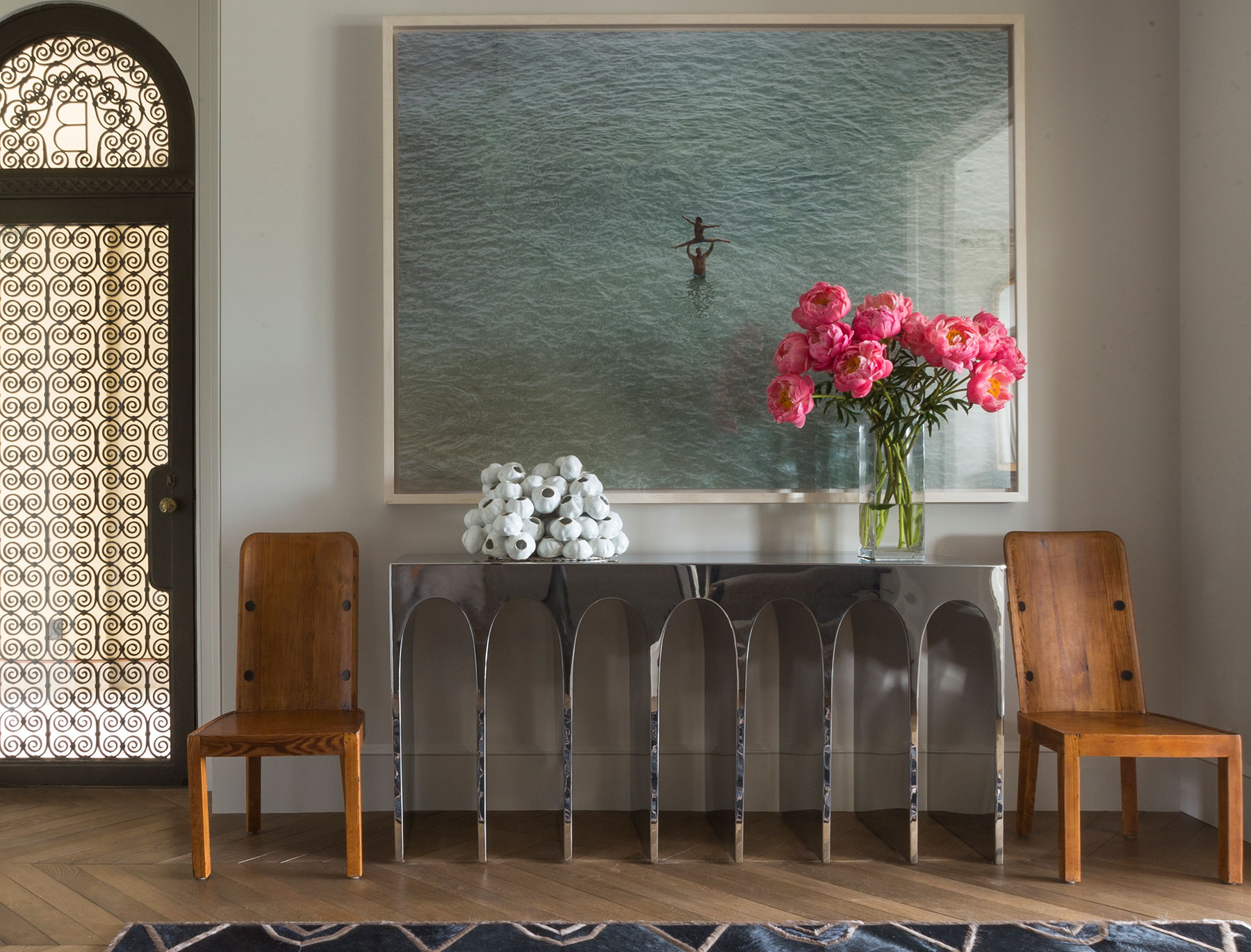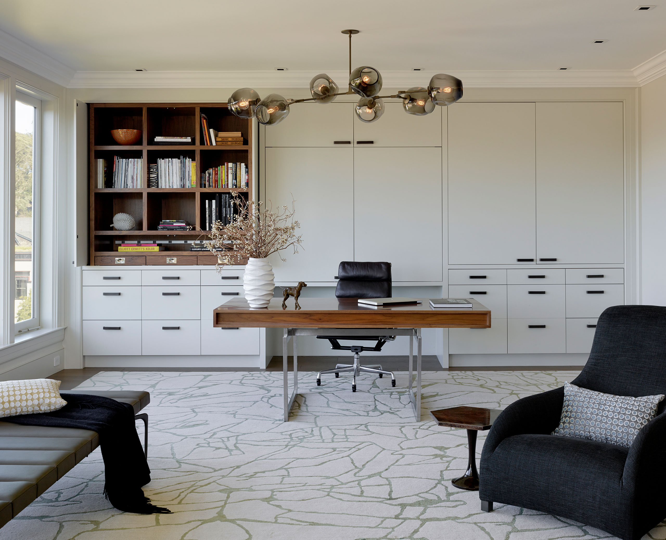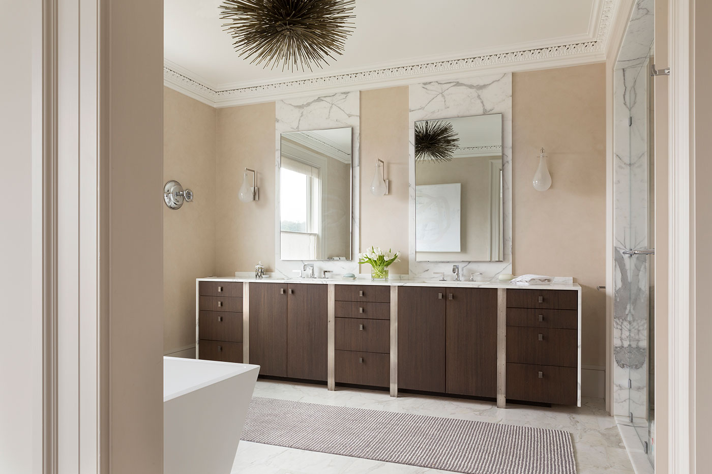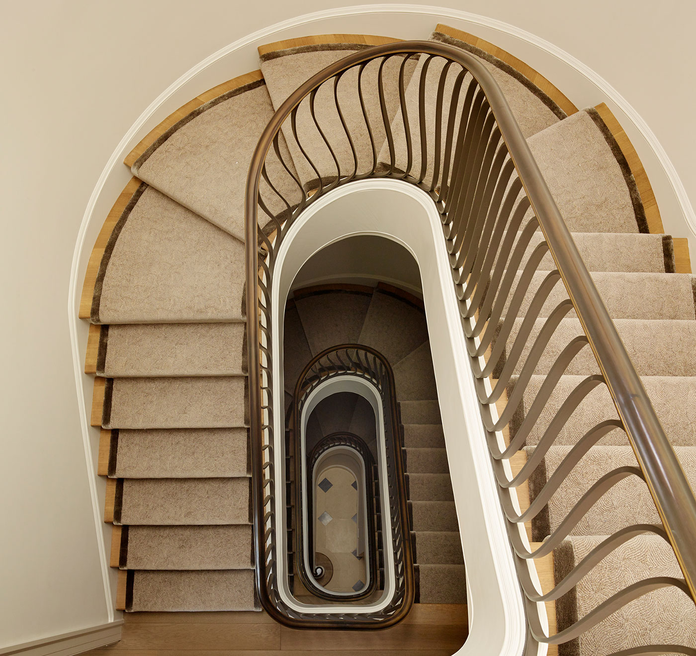 JKA and Sutro Architects reconfigured the house to four full floors connected by a sensuously curved staircase with bronze railing. New custom-finished oak floors, intricate plaster moldings, and floor-to-ceiling curtains evoke the character of Parisian old-world elegance.