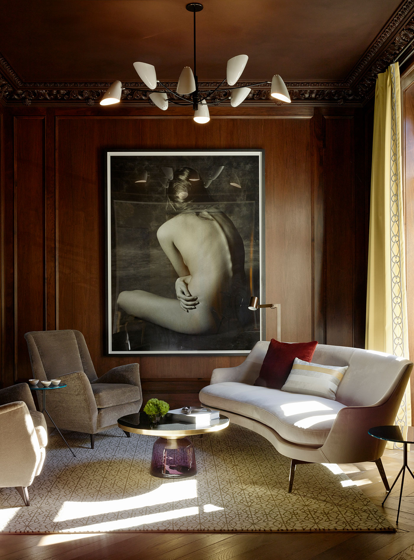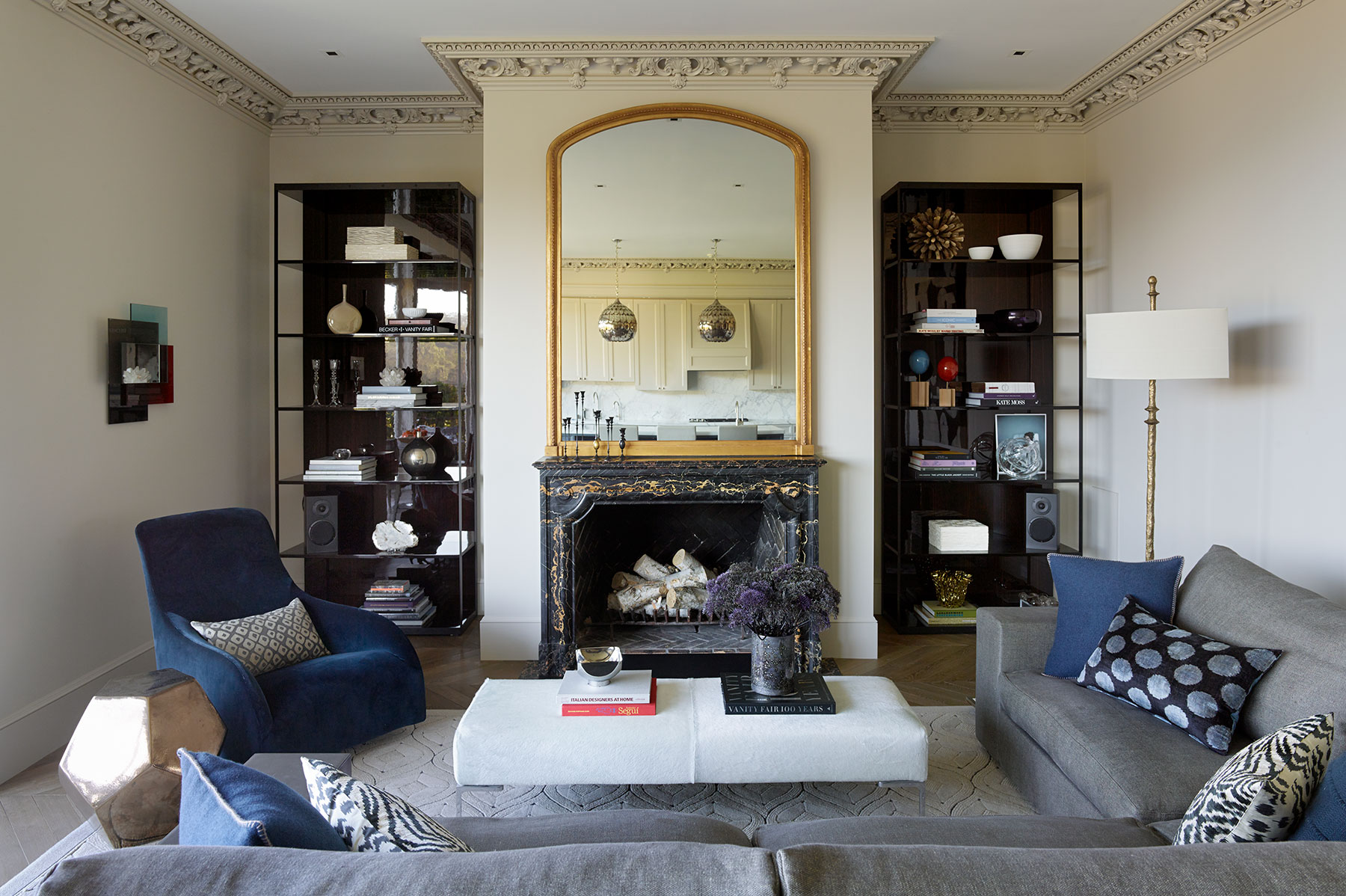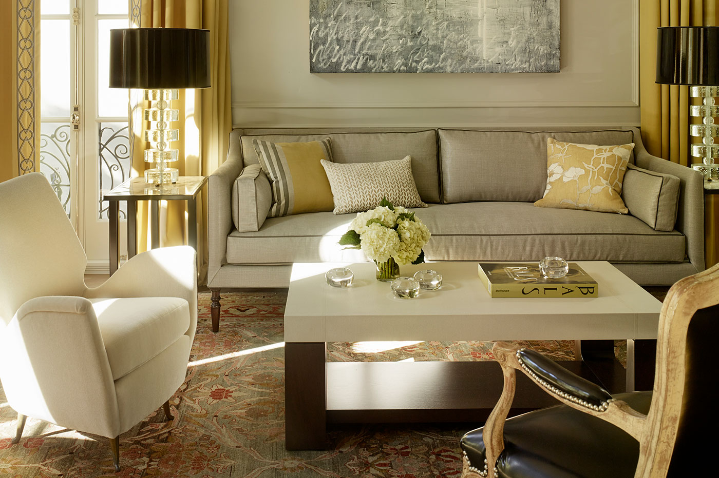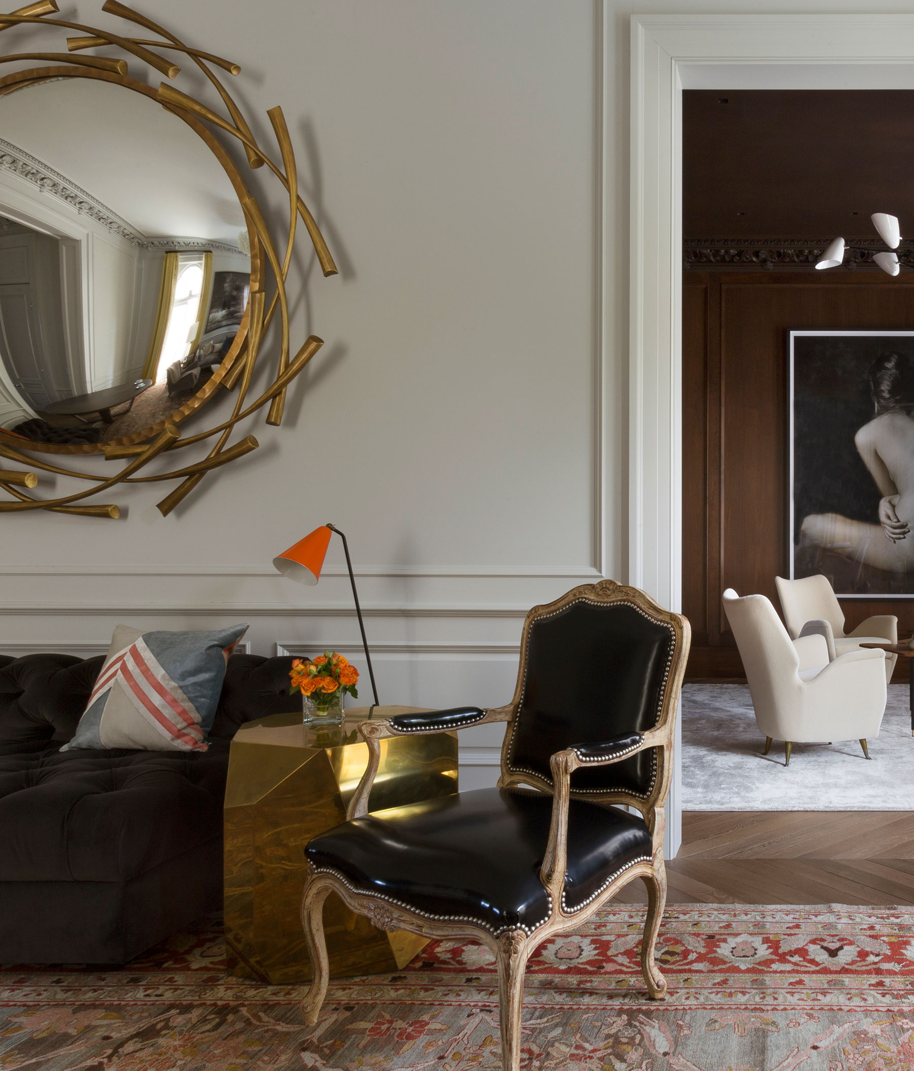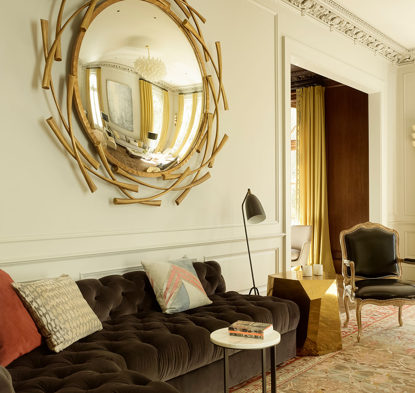 A literary salon would feel at home in the living room, where a combination of European vintage and modern furnishings, golden hues, velvet, and leather foster an air of luxury and comfort.