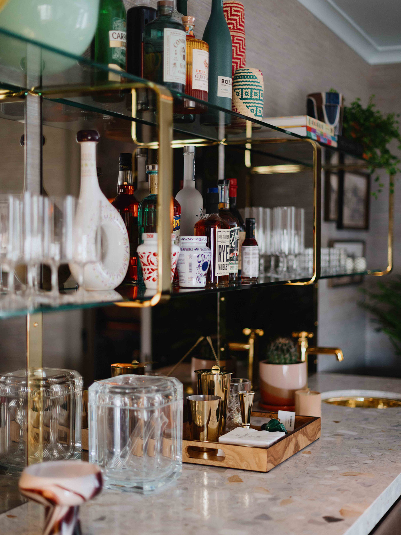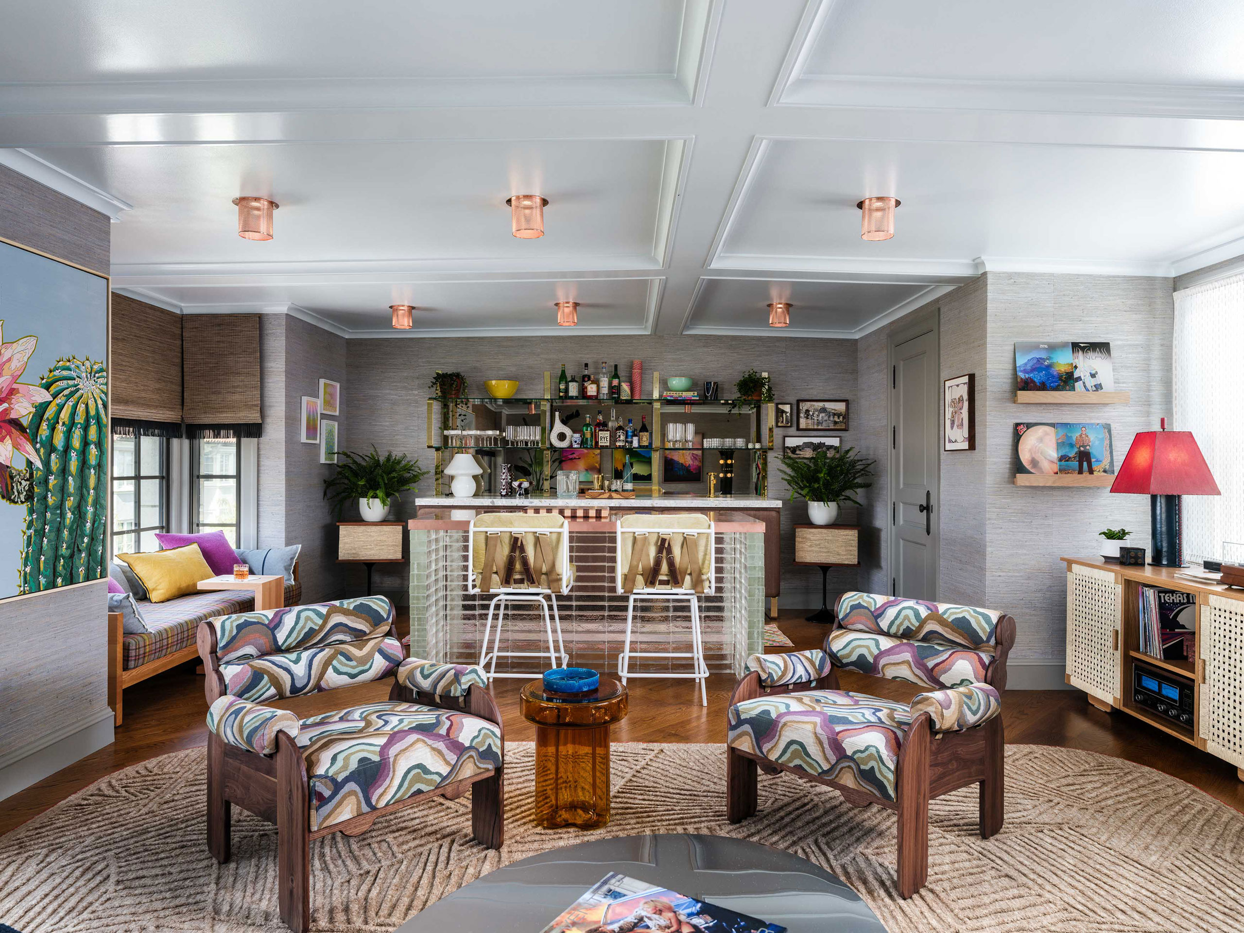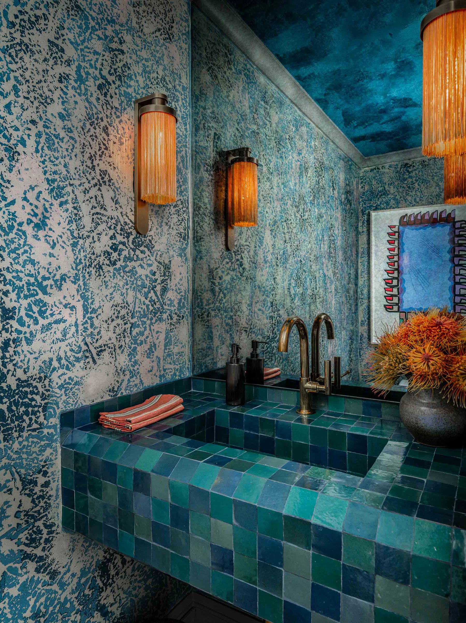 Upon entering, you found yourself encircled by a room of layered juxtapositions: a hint of 1970s glam with a touch of Western swagger; rich, brilliant colors played off of dusty desert tones; deliciously soft, luxurious textiles mingled with more rugged textures; cool shiny metals contrasted with warm wood. There was also a moody, sexy little powder room with Moroccan zellige tile, fringed sconces, and a layered Venetian plaster wall finish.