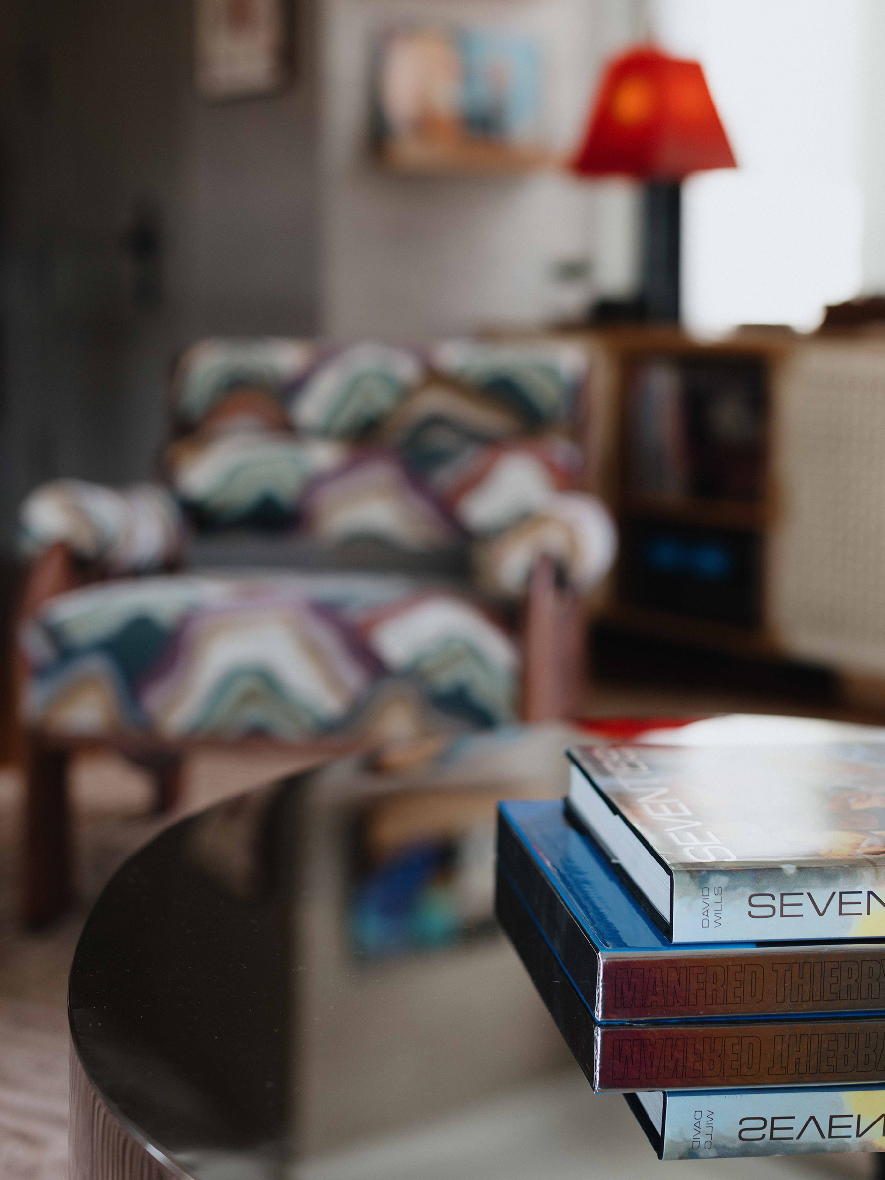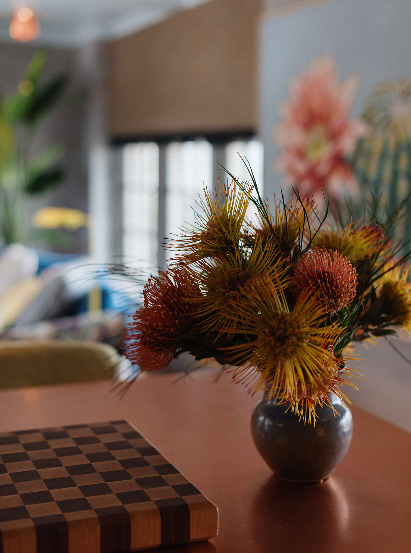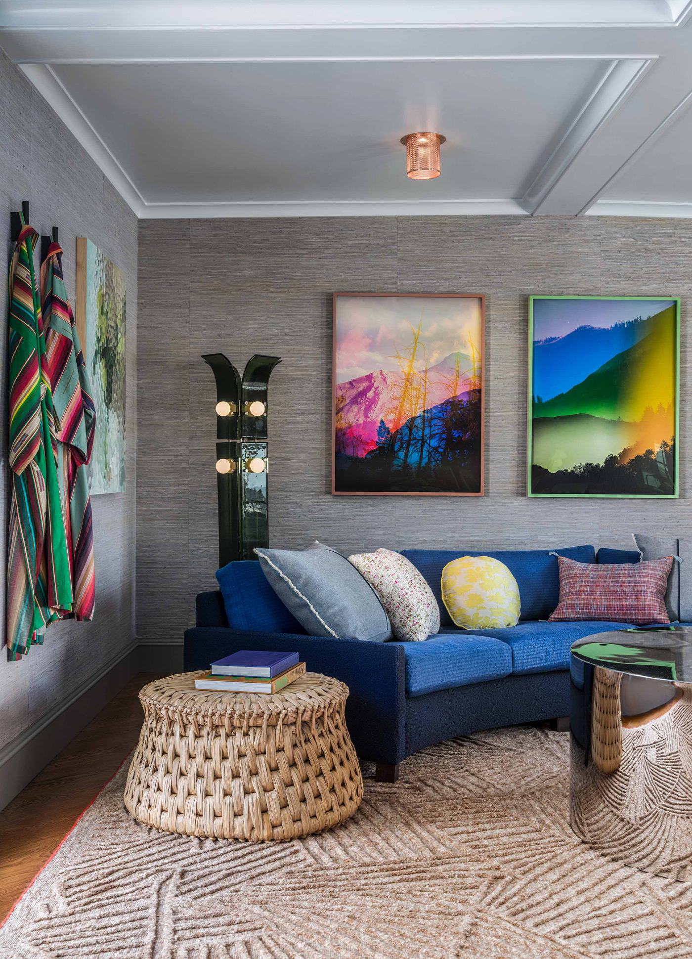 Upon entering, you found yourself encircled by a room of layered juxtapositions: a hint of 1970s glam with a touch of Western swagger; rich, brilliant colors played off of dusty desert tones; deliciously soft, luxurious textiles mingled with more rugged textures; cool shiny metals contrasted with warm wood. There was also a moody, sexy little powder room with Moroccan zellige tile, fringed sconces, and a layered Venetian plaster wall finish.