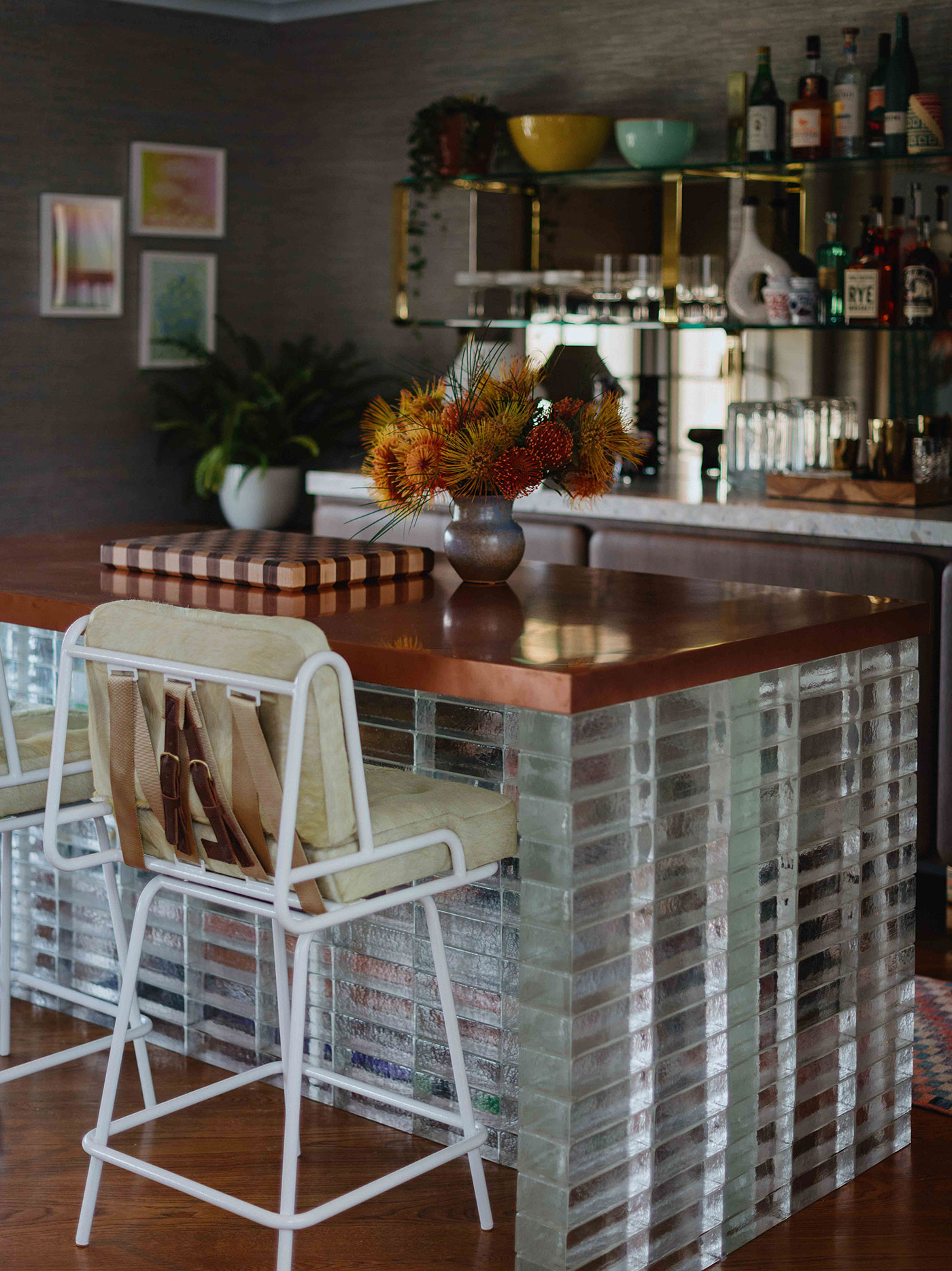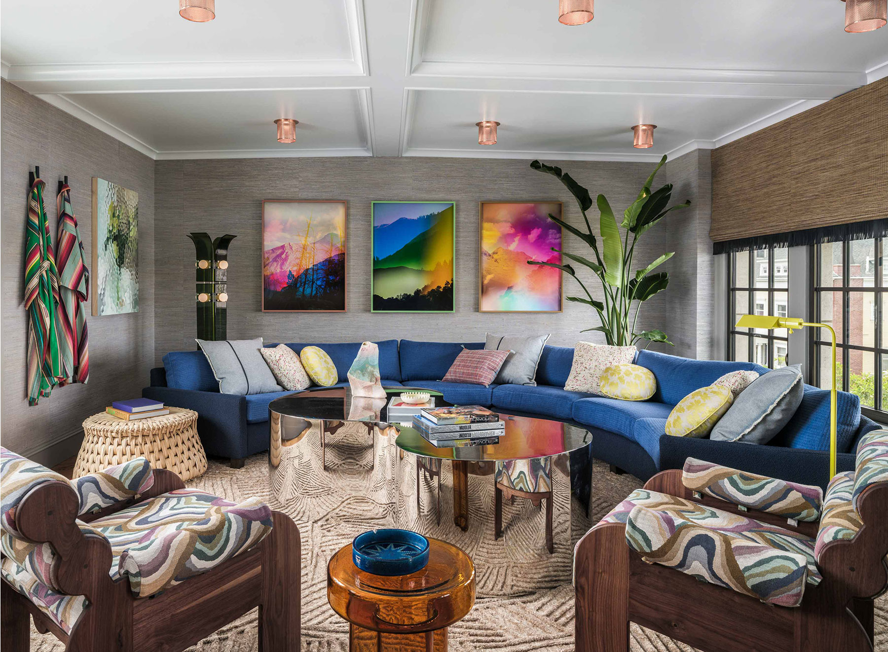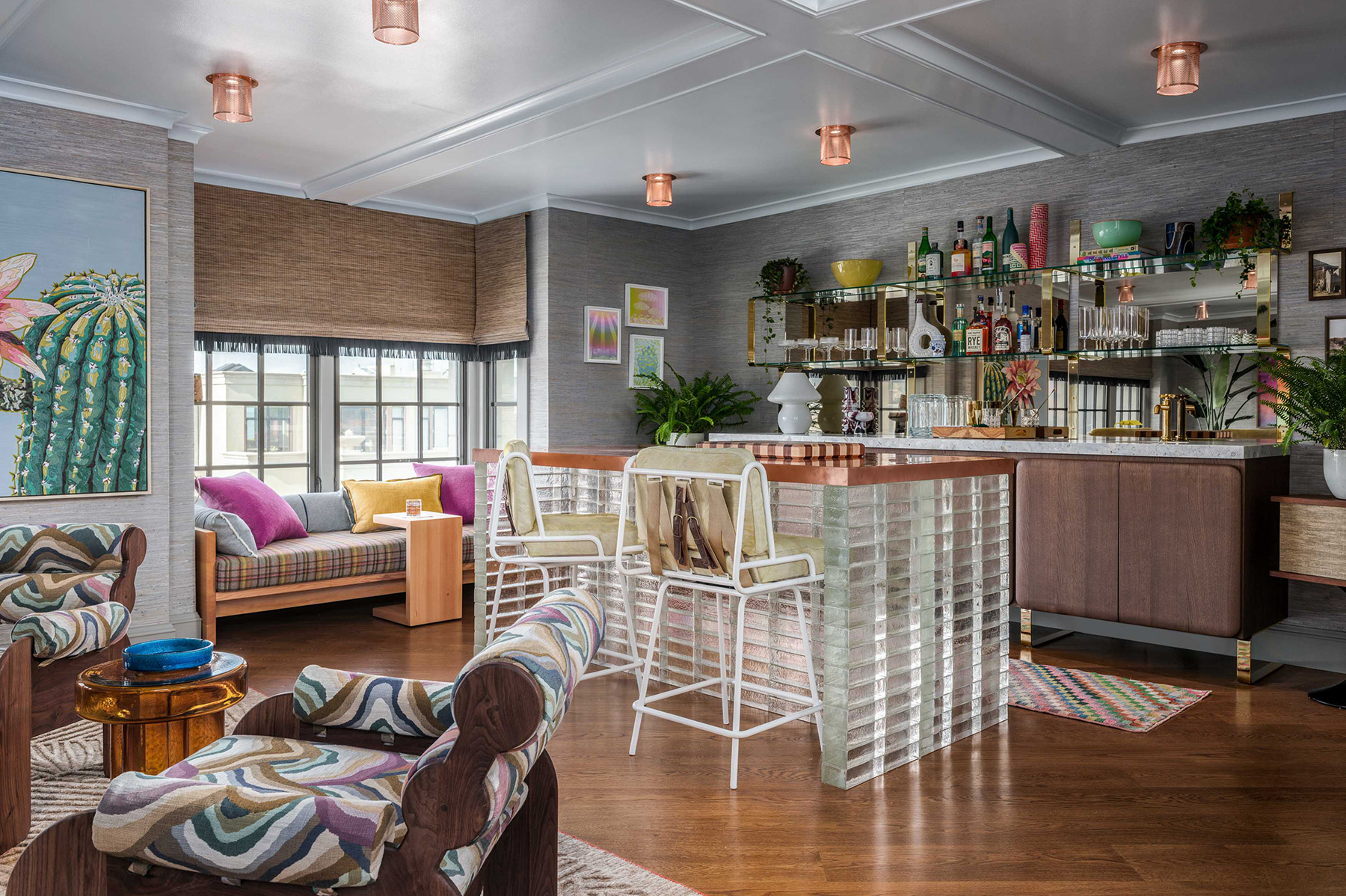 JKA’s 2025 Decorator Showcase room was a technicolor homage to the West (Texas, Arizona, California), referencing our Principal Designer’s own Texas roots and westward migration. We imagined our rooftop listening lounge as a vibrant, inviting space to unwind from the demands and distractions of modern life…to step down, maybe mix up a few cocktails (at our ice-inspired cast glass brick bar), contemplate some great art, and revel in a good old-fashioned time-out.