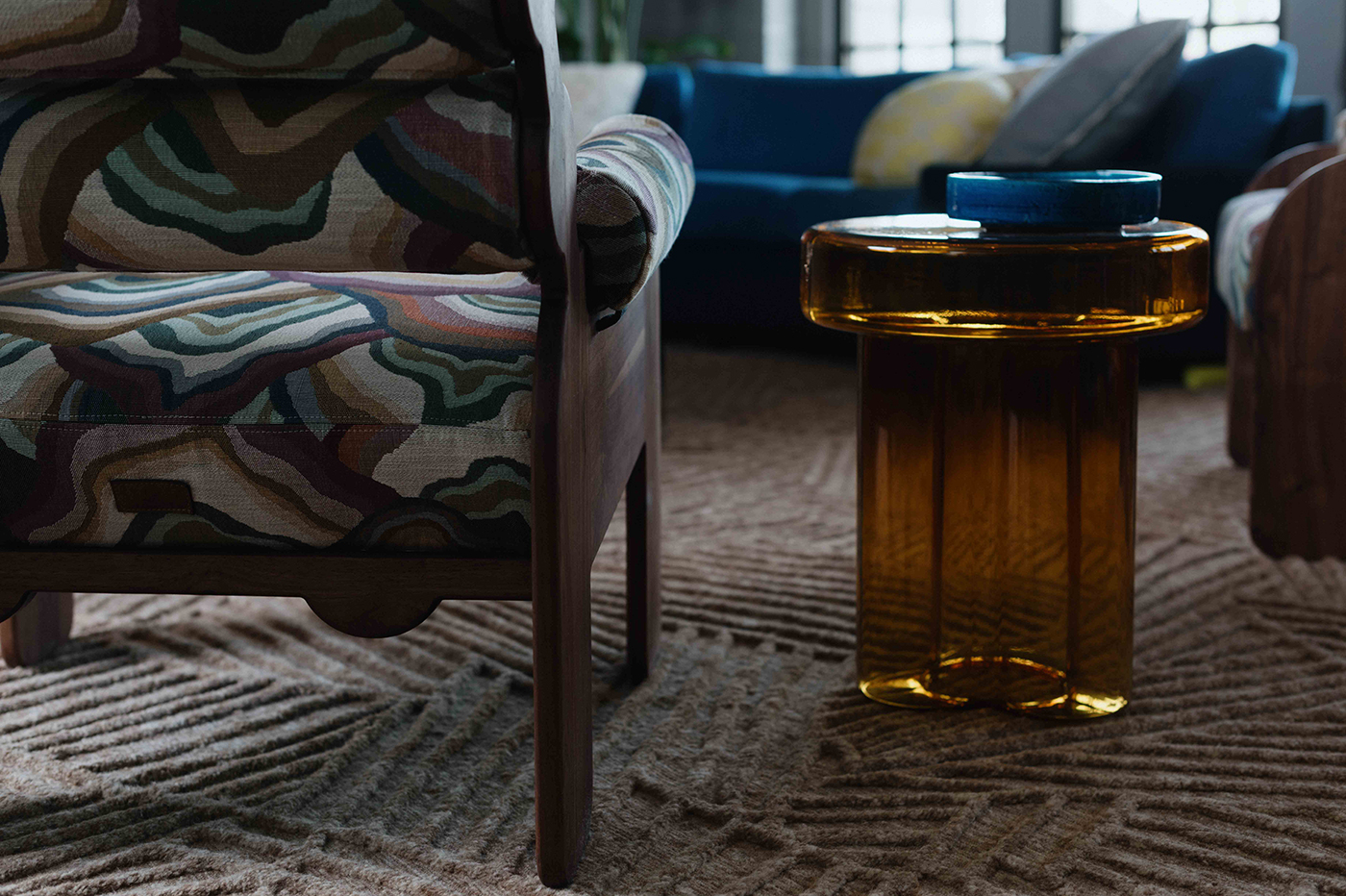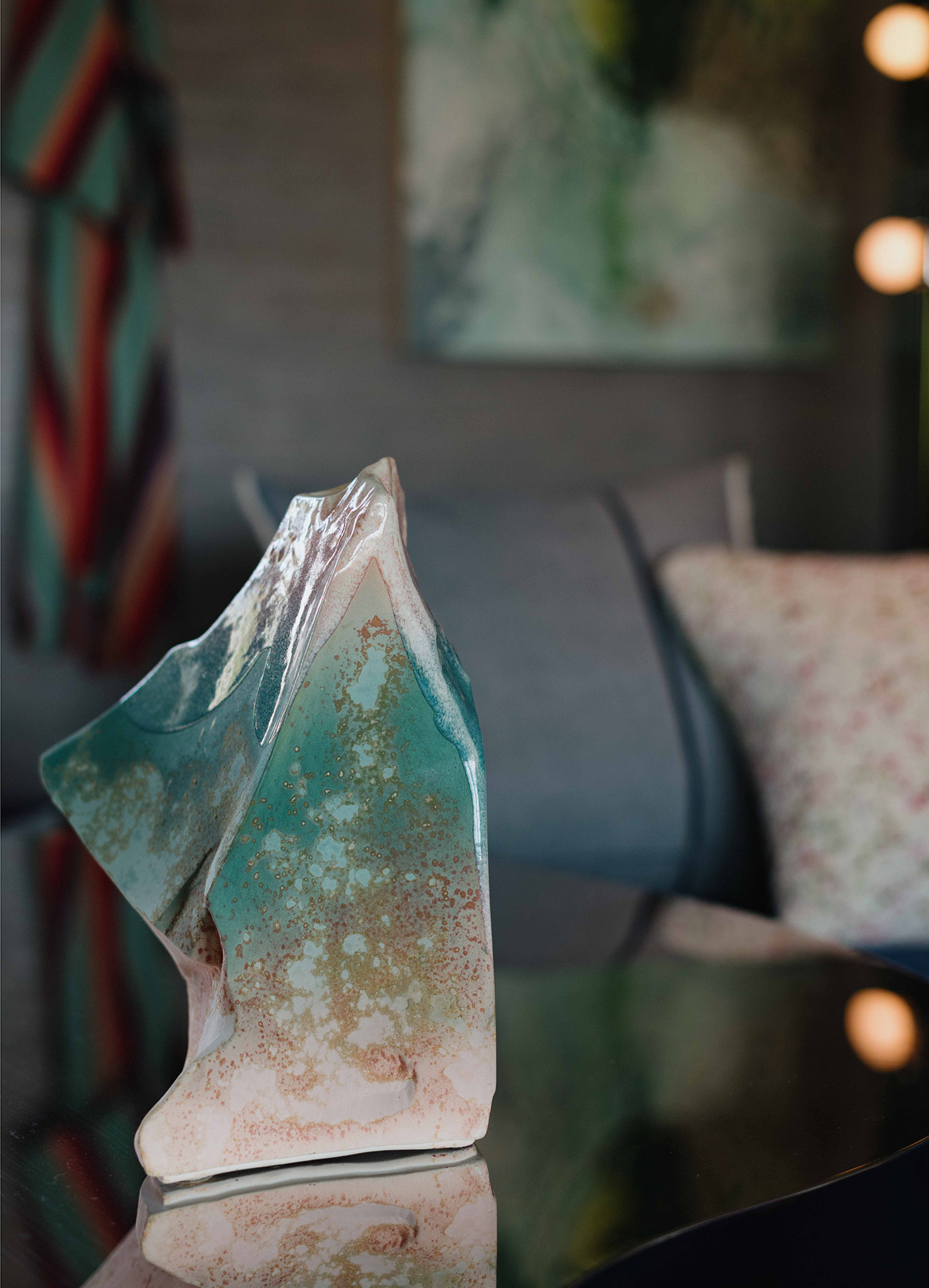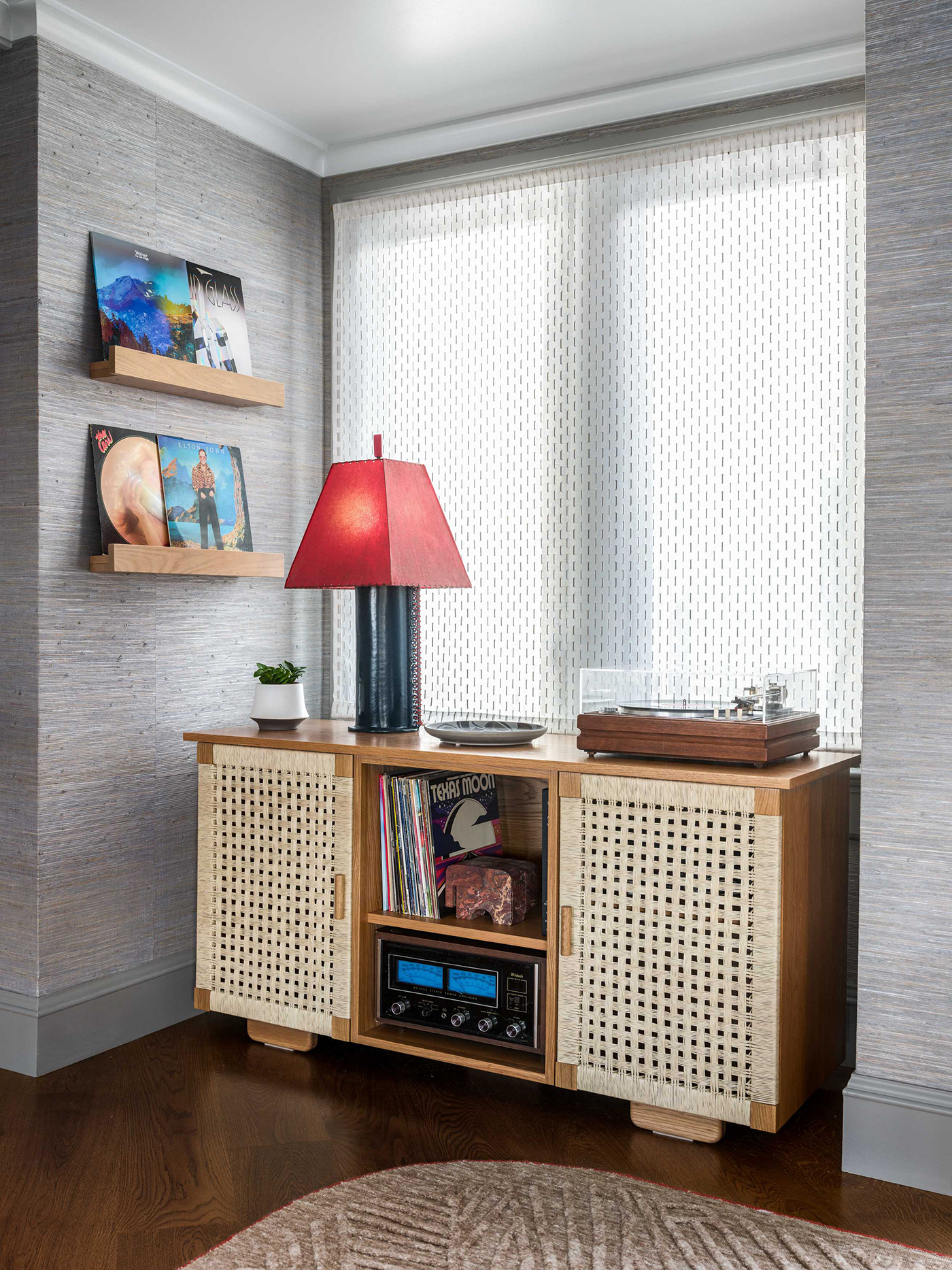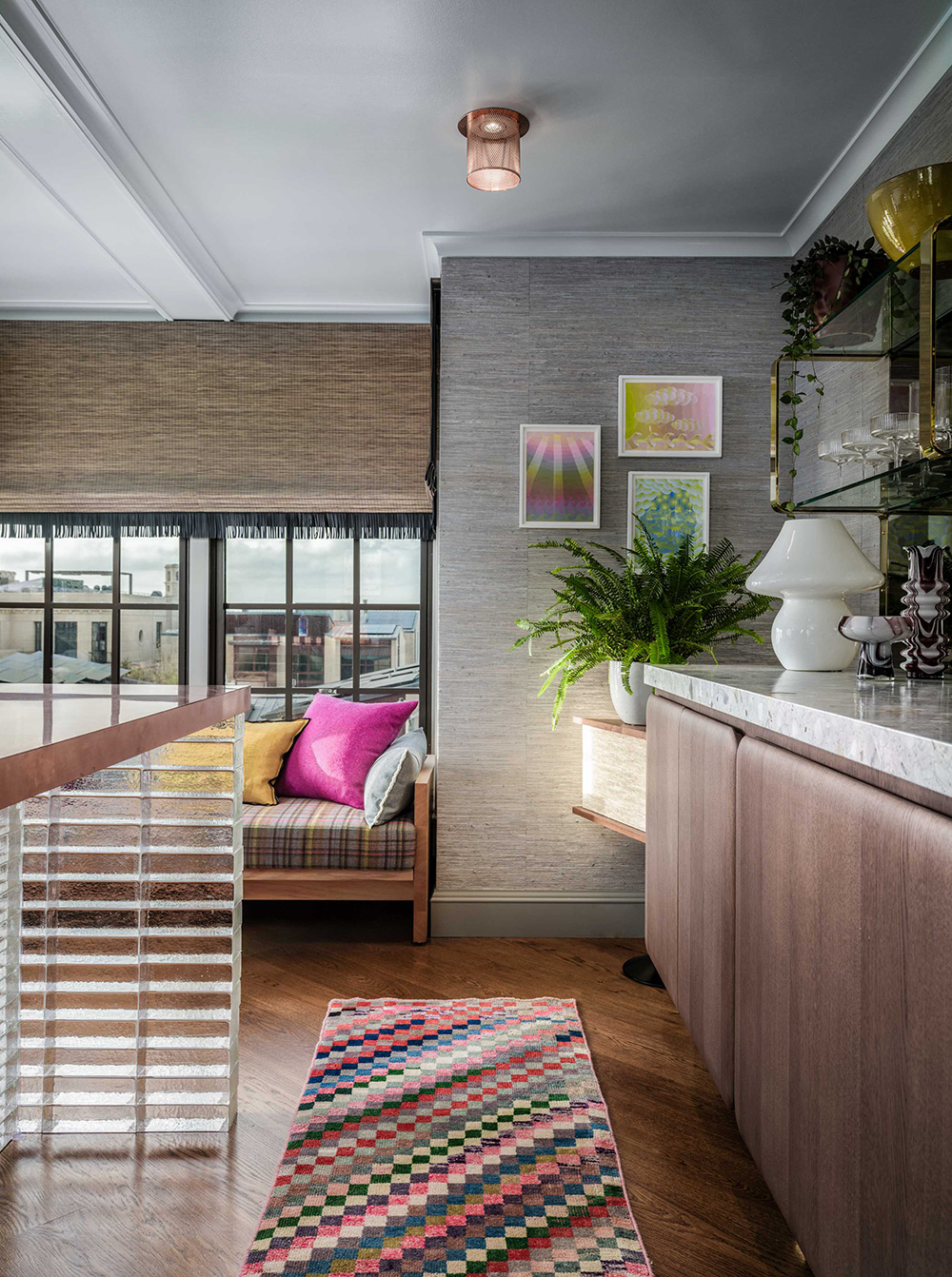 JKA’s 2025 Decorator Showcase room was a technicolor homage to the West (Texas, Arizona, California), referencing our Principal Designer’s own Texas roots and westward migration. We imagined our rooftop listening lounge as a vibrant, inviting space to unwind from the demands and distractions of modern life…to step down, maybe mix up a few cocktails (at our ice-inspired cast glass brick bar), contemplate some great art, and revel in a good old-fashioned time-out.